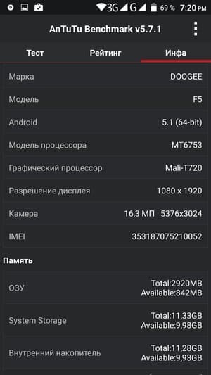 Аппаратная платформа Doogee F5 строится на базе уже знакомой восьмиядерной однокристальной системы (SoC) MediaTek MT6753. Это более слабая платформа в сравнении с MT6752, рабочая частота ее ядер CPU урезана, а также используется менее производительный видеоускоритель. В конфигурацию данной SoC входят все те же восемь процессорных ядер Cortex-A53, но работают они на частоте до 1,3 ГГц. За обработку графики здесь отвечает видеоускоритель Mali-T720. Объем ОЗУ составляет 3 ГБ, а собственной памяти для нужд пользователя в устройстве изначально доступно около 11 ГБ из общего объема 16 ГБ. Есть возможность подключения карт microSD, но тогда придется вынуть вторую SIM-карту. На практике наша проверочная карта Transcend Premium microSDXC UHS-1 объемом 128 ГБ уверенно распозналась устройством. Также поддерживается подключение внешних устройств в режиме USB OTG.