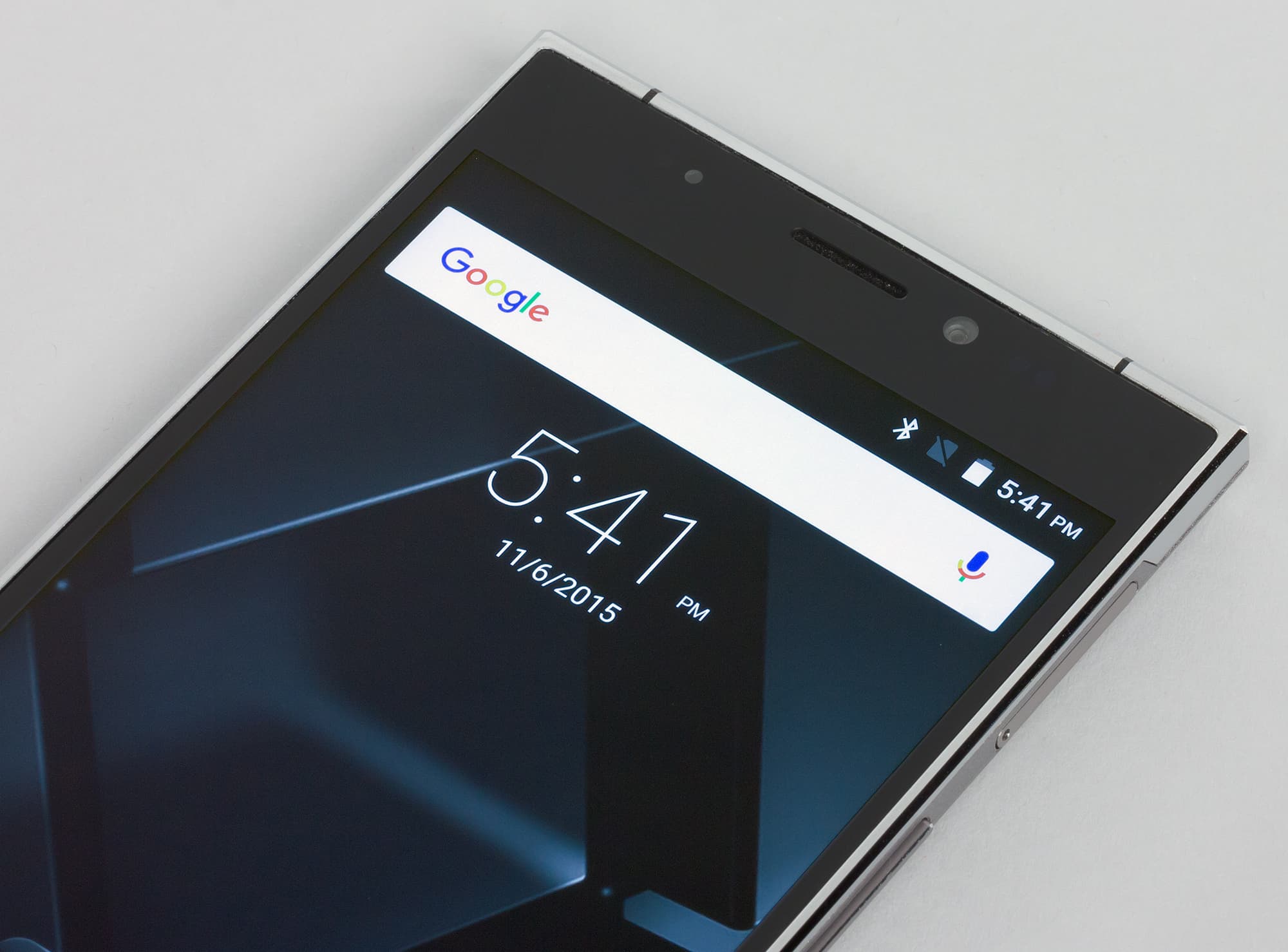 Лицевая поверхность экрана выполнена в виде стеклянной пластины с зеркально-гладкой поверхностью, устойчивой к появлению царапин. Судя по отражению объектов антибликовые свойства экрана не хуже, чем у экрана Google Nexus 7 (2013) (далее просто Nexus 7). Для наглядности приведем фотографию, на которой в выключенных экранах отражается белая поверхность (слева — Nexus 7, справа — Doogee F5, далее их можно различать по размеру):