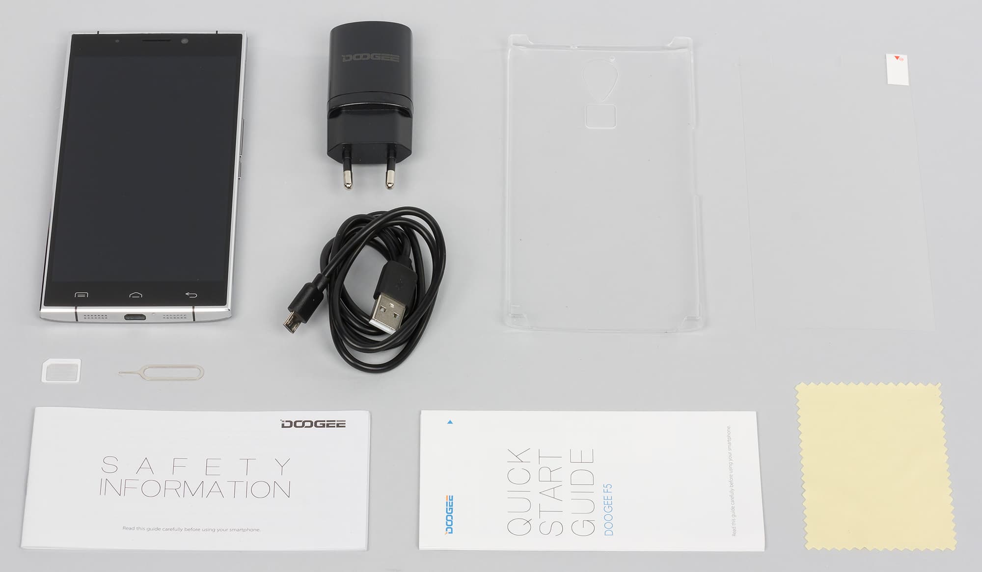 Сам комплект небогат, он состоит лишь из зарядного устройства (на 2 А) и соединительного кабеля Micro-USB. Также в наборе оказалась защитная пленка на экран, но ее, скорее всего, вложил продавец. Помимо этого в комплекте Doogee F5 обнаружился простенький защитный чехол-накладка, выполненный из твердого прозрачного пластика. Поскольку корпус смартфона целиком выполнен из прочного металла, смысла в этом чехле совершенно нет, он лишь увеличивает размеры и без того крупного устройства.