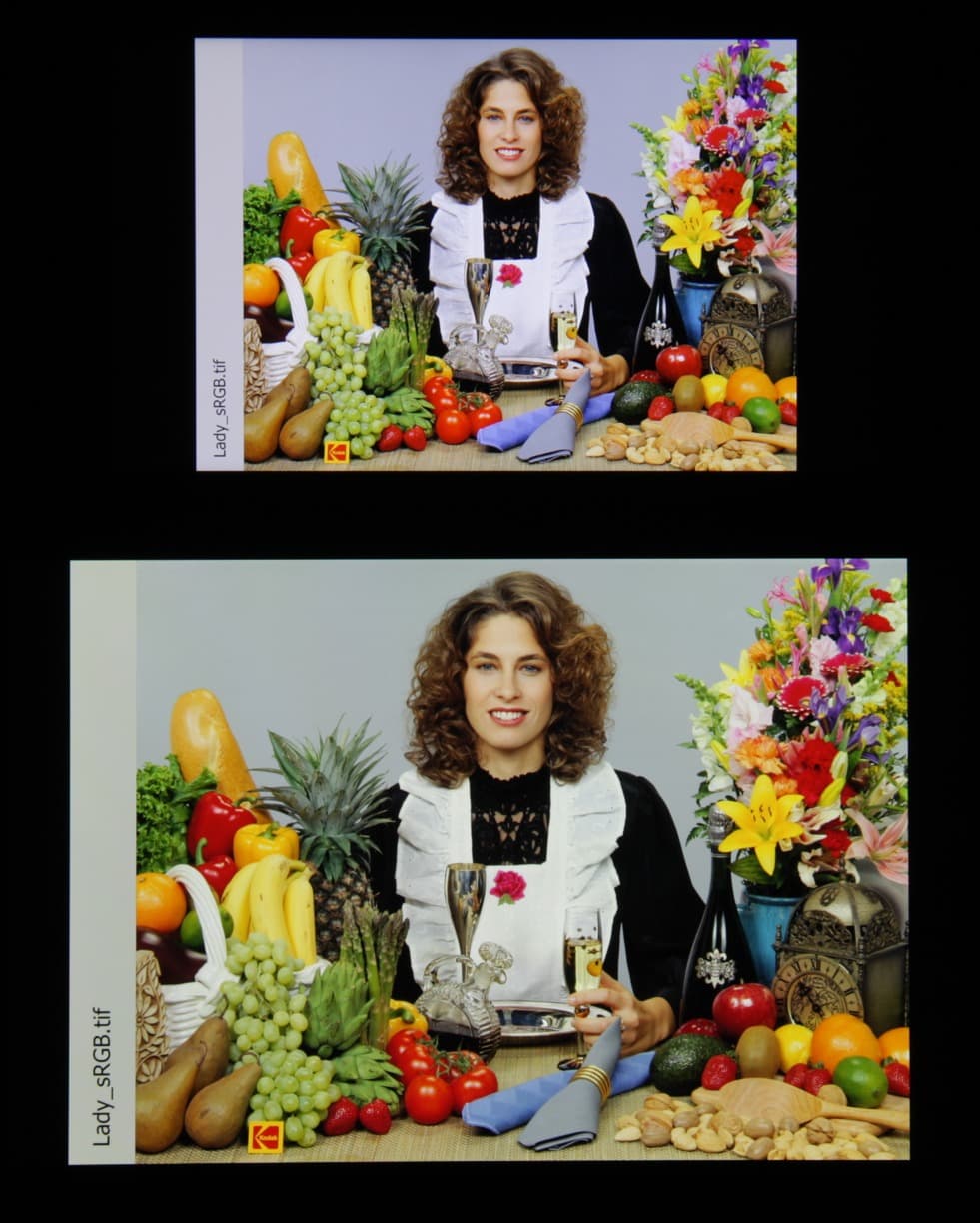 Однако отклонения координат первичных цветов от вершин треугольника sRGB небольшие, поэтому цвета имеют естественную насыщенность и оттенок. Баланс оттенков на шкале серого плохой, так как цветовая температура существенно выше стандартных 6500 К. Правда, отклонение от спектра абсолютно черного тела (ΔE) меньше 10, что для потребительского устройства считается приемлемым показателем. Однако при этом ΔE и цветовая температура сильно изменяются от оттенка к оттенку — это отрицательно сказывается на визуальной оценке цветового баланса. (Самые темные области шкалы серого можно не учитывать, так как там баланс цветов не имеет большого значения, да и погрешность измерений цветовых характеристик на низкой яркости большая.)