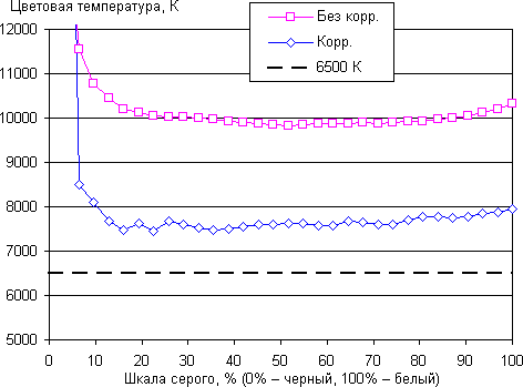 В итоге цвета имеют естественную насыщенность и оттенок. Баланс оттенков на шкале серого плохой, так как цветовая температура очень сильно выше стандартных 6500 К, но хотя бы отклонение от спектра абсолютно черного тела (ΔE) ниже 10, что для потребительского устройства считается приемлемым показателем. При этом оба параметра мало изменяются от оттенка к оттенку — это положительно сказывается на визуальной оценке цветового баланса. (Самые темные области шкалы серого можно не учитывать, так как там баланс цветов не имеет большого значения, да и погрешность измерений цветовых характеристик на низкой яркости большая.)