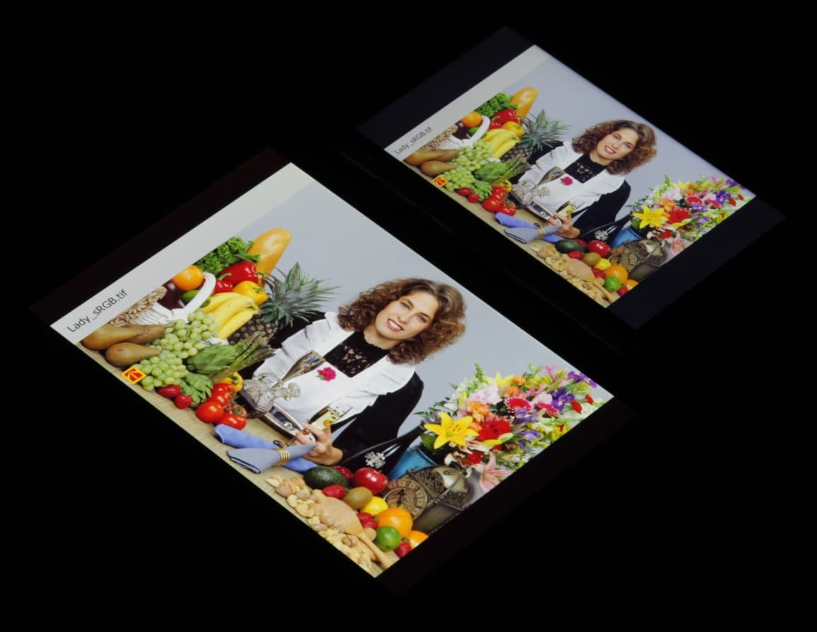 Экран имеет хорошие углы обзора без значительного сдвига цветов даже при больших отклонениях взгляда от перпендикуляра к экрану и без инвертирования оттенков. Для сравнения приведем фотографии, на которых на экраны Doogee S60 и Nexus 7 выведены одинаковые изображения, при этом яркость экранов изначально установлена примерно на 200 кд/м², а цветовой баланс на фотоаппарате принудительно переключен на 6500 К.