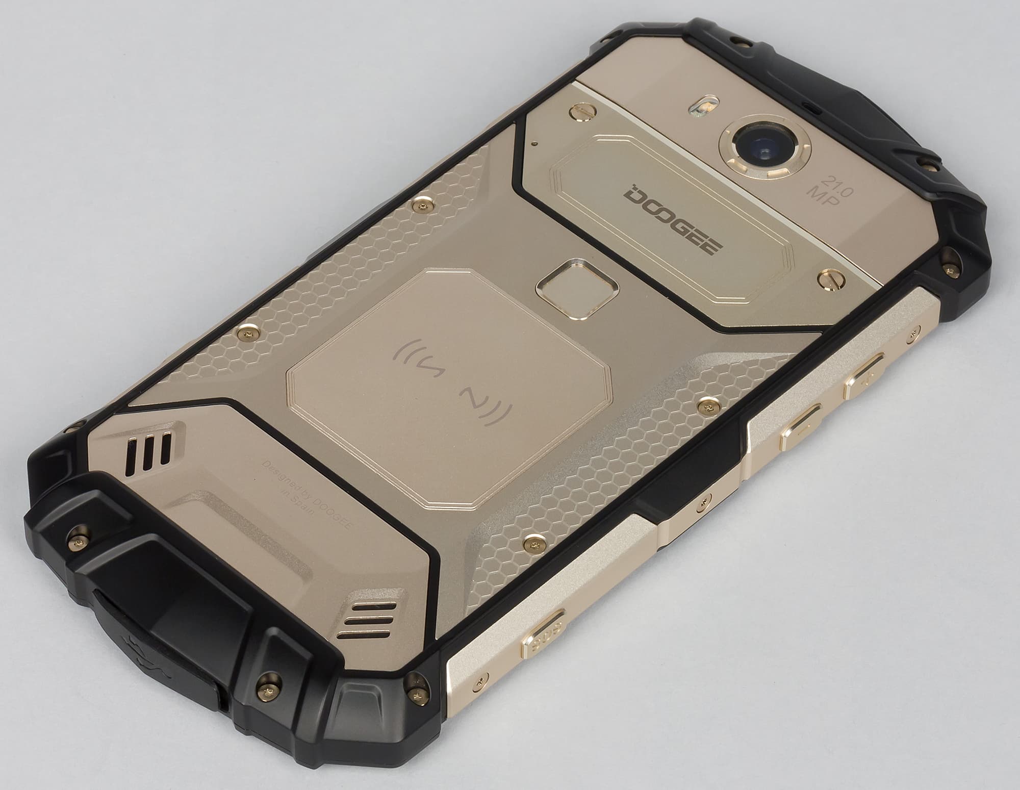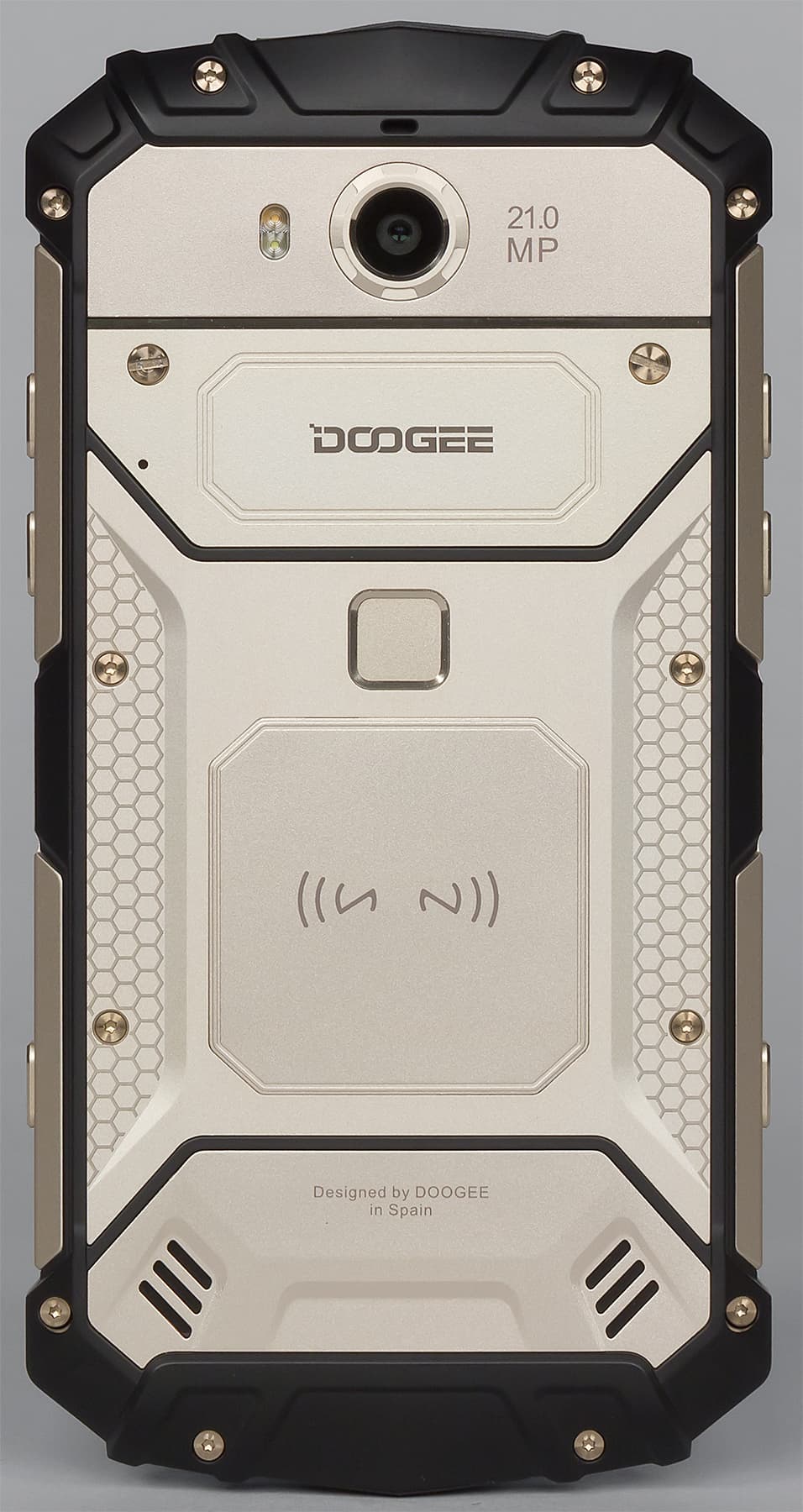 Doogee S60 выполнен в привычном для такого рода изделий дизайне и форм-факторе: это крупный моноблок, заключенный в массивный кожух из металла и прорезиненного пластика. Многочисленные металлические и пластиковые детали перемежаются так часто, что трудно определенно сказать, пластиковый ли это корпус с металлическими накладками или же металлический корпус с накладками из пластмассы.