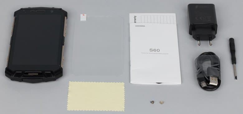 Doogee S60 оснащен дисплеем IPS, прикрытым плоским защитным стеклом без покатых краев. Это вполне логично, так как у плоского стекла меньше шансов задеть что-либо при падении, а со всех сторон оно защищено выступающим прорезиненным бортиком. Официально заявлено, что здесь используется Corning Gorilla Glass 5, хотя любые такие обещания китайских производителей всегда следует воспринимать с долей скептицизма.