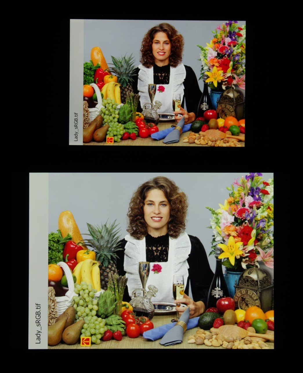 Такое мы уже видели в случае, например, Sony Xperia Z2 и других мобильных устройств. Sony указывает, что в этих экранах используются светодиоды с синим излучателем и зеленым и красным люминофором (обычно — синий излучатель и желтый люминофор), что в сочетании со специальными светофильтрами матрицы и позволяет получить широкий цветовой охват. Да, и в красном люминофоре, видимо, используются так называемые квантовые точки. Для потребительского устройства широкий цветовой охват является никак не достоинством, а существенным недостатком, поскольку в итоге цвета изображений — рисунков, фотографий и фильмов, — ориентированных на пространство sRGB (а таких подавляющее большинство), имеют неестественную насыщенность. Особенно это заметно на узнаваемых оттенках, например на оттенках кожи. Результат приведен на фотографии выше.