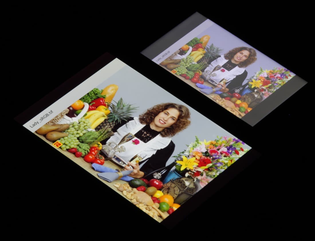 Экран имеет хорошие углы обзора без значительного сдвига цветов даже при больших отклонениях взгляда от перпендикуляра к экрану и без инвертирования оттенков. Для сравнения приведем фотографии, на которых на экраны Doogee Shoot 2 и Nexus 7 выведены одинаковые изображения, при этом яркость экранов изначально установлена примерно на 200 кд/м², а цветовой баланс на фотоаппарате принудительно переключен на 6500 К.