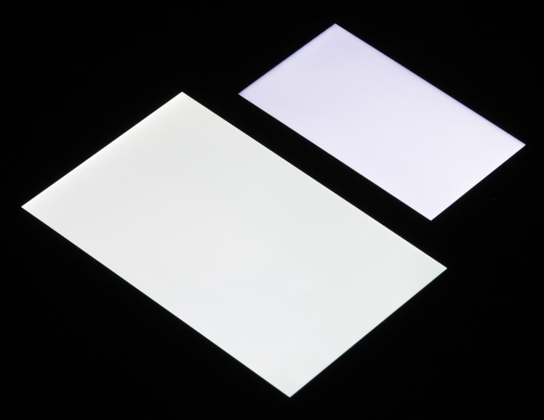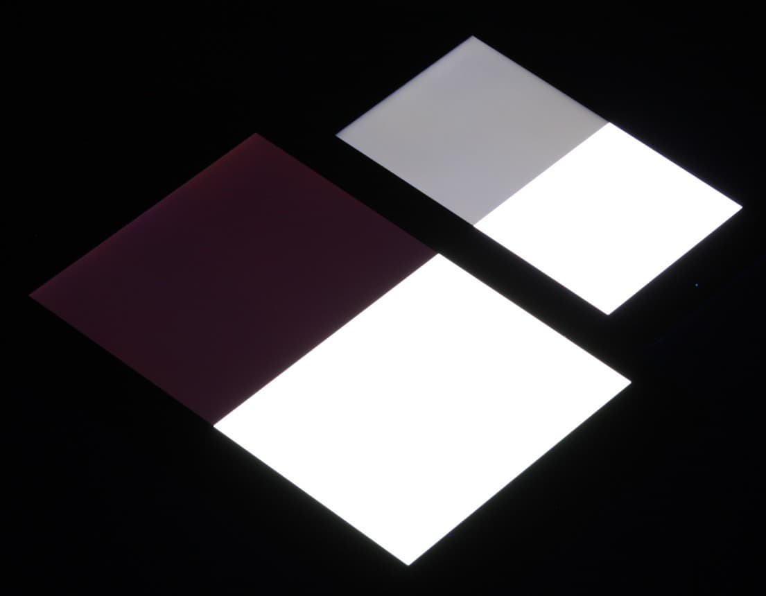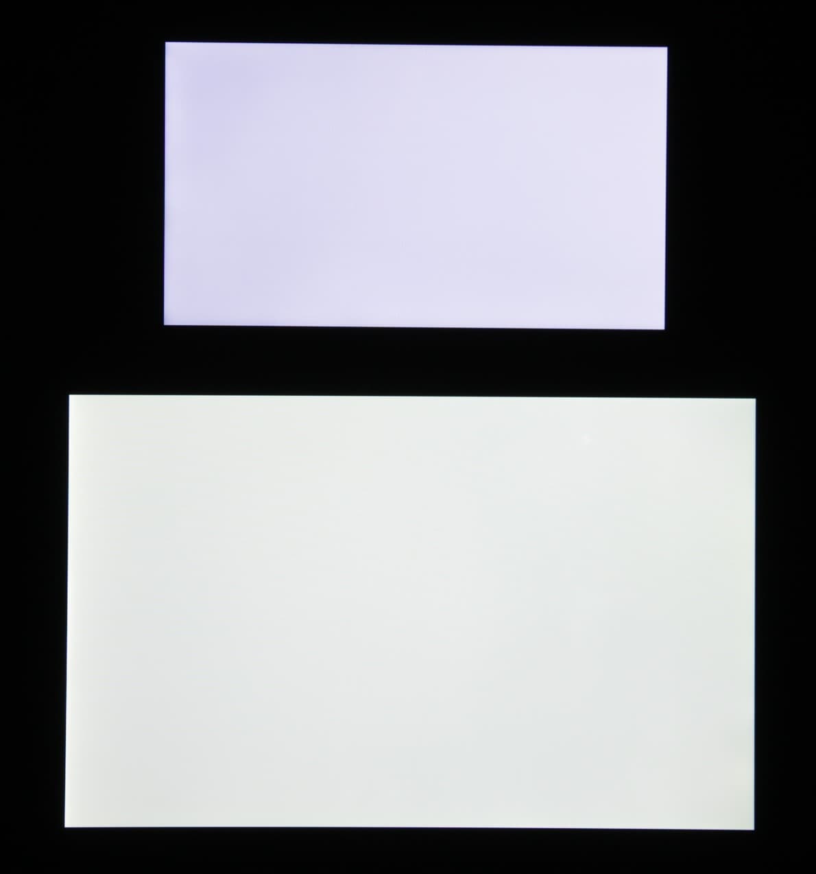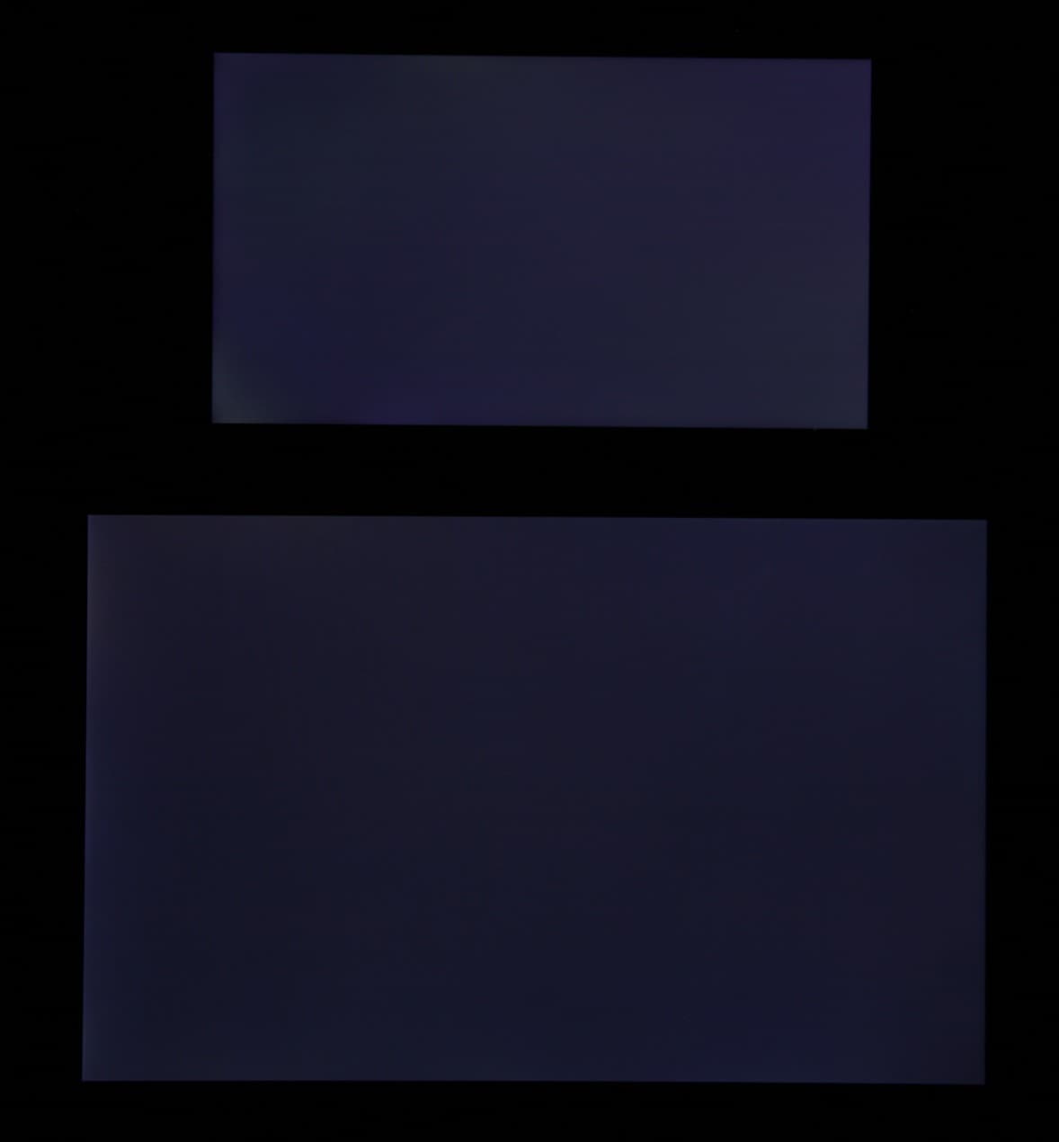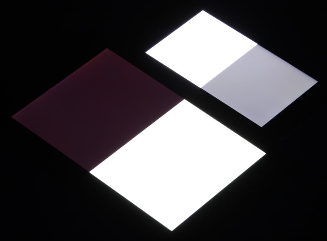 Яркость под углом у экранов уменьшилась (как минимум в 5 раз, исходя из разницы в выдержке), и уменьшилась примерно одинаково. Черное поле при отклонении по диагонали высветляется очень сильно, но остается примерно нейтрально-серым по оттенку. Фотографии ниже это демонстрируют (яркость белых участков в перпендикулярном плоскости экранов направлении одинаковая!):
