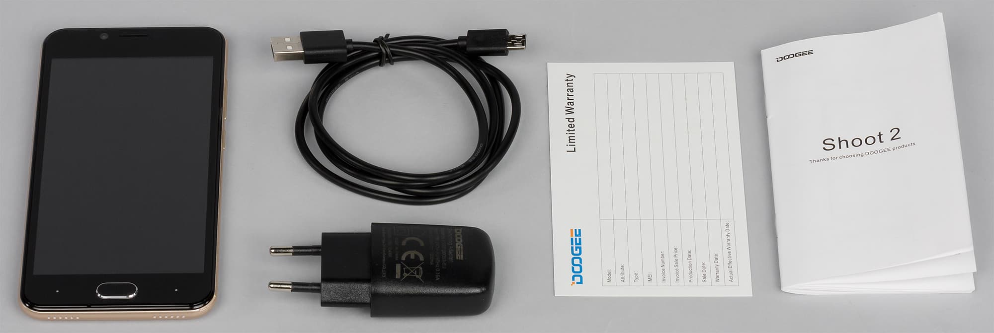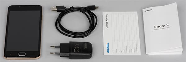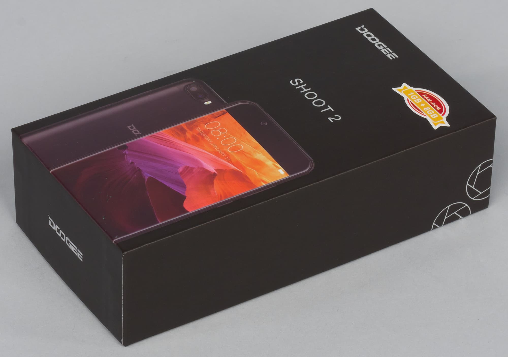 Смартфон Doogee Shoot 2 поставляется в продажу в миниатюрной коробочке, выполненной из твердого матового картона черного цвета с простым оформлением.