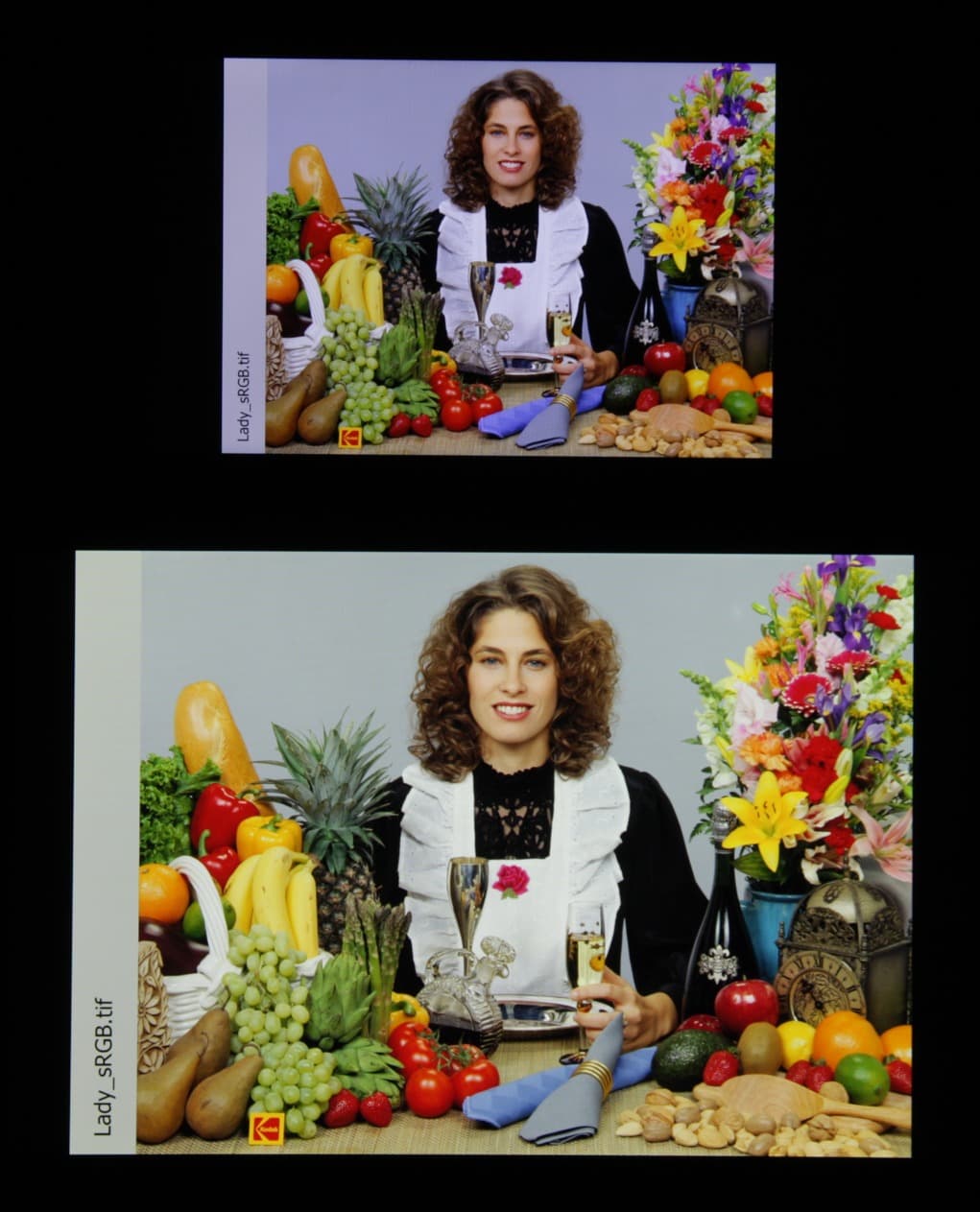 В итоге цвета имеют естественную насыщенность. Баланс оттенков на шкале серого плохой, так как цветовая температура сильно выше стандартных 6500 К, но хотя бы отклонение от спектра абсолютно черного тела (ΔE) равно примерно 10, что для потребительского устройства считается приемлемым показателем. При этом цветовая температура и ΔE мало изменяются от оттенка к оттенку — это положительно сказывается на визуальной оценке цветового баланса. (Самые темные области шкалы серого можно не учитывать, так как там баланс цветов не имеет большого значения, да и погрешность измерений цветовых характеристик на низкой яркости большая.)