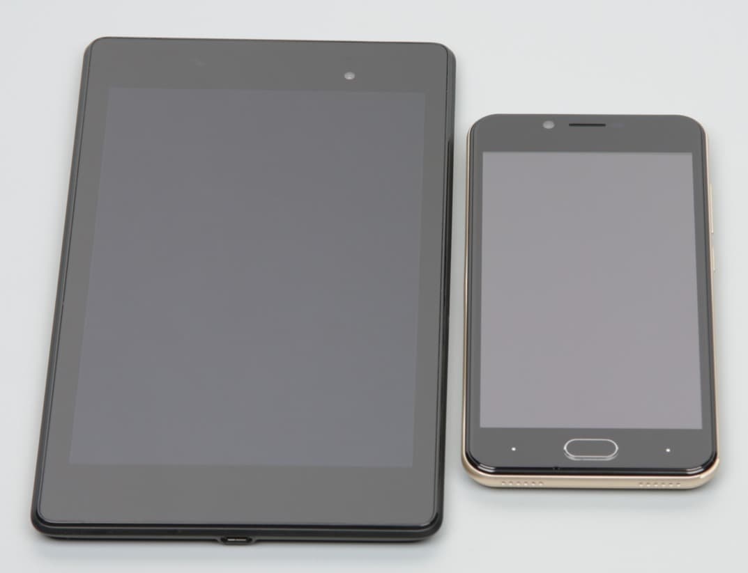 Лицевая поверхность экрана выполнена в виде стеклянной пластины с зеркально-гладкой поверхностью, устойчивой к появлению царапин. Судя по отражению объектов, антибликовые свойства экрана гораздо хуже, чем у экрана Google Nexus 7 (2013) (ниже просто Nexus 7). Для наглядности приведем фотографию, на которой в выключенных экранах отражается белая поверхность (слева — Nexus 7, справа — Doogee Shoot 2, далее их можно различать по размеру):