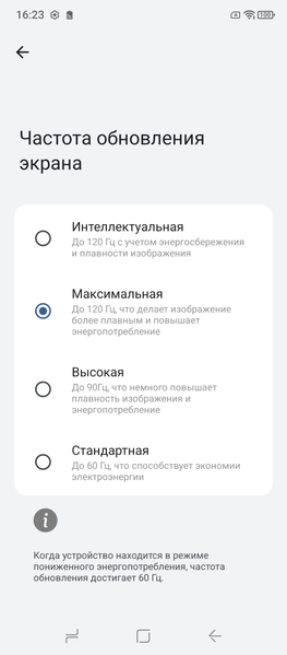 Контрастность (примерно в центре экрана) высокая — порядка 1200:1. Время отклика при переходе черный-белый-черный равно 20 мс (11 мс вкл. + 9 мс выкл.). Переход между полутонами серого 25% и 75% (по численному значению цвета) и обратно в сумме занимает 32 мс. В настройках экрана можно включить режим с повышенной до 90 или 120 Гц частотой обновления, что приводит как минимум к увеличению плавности прокрутки списков в меню.