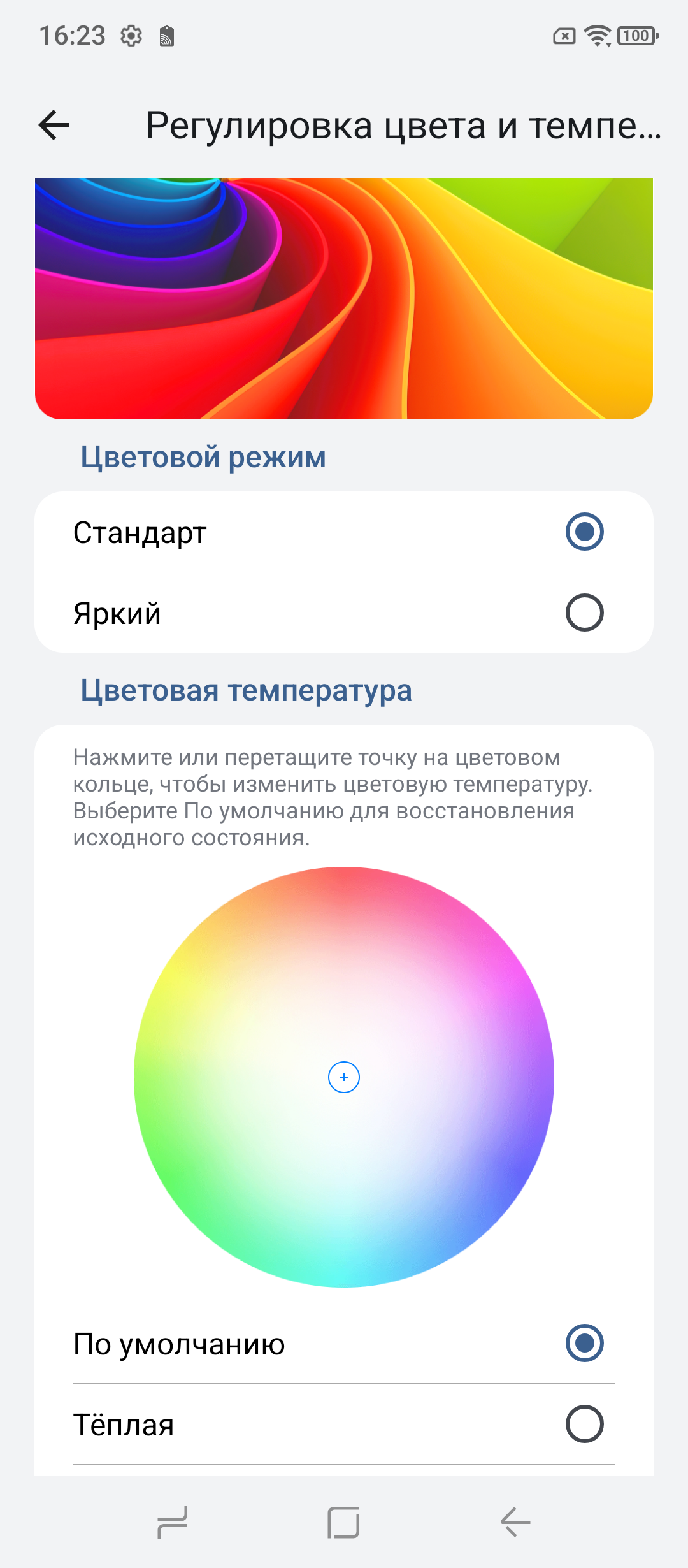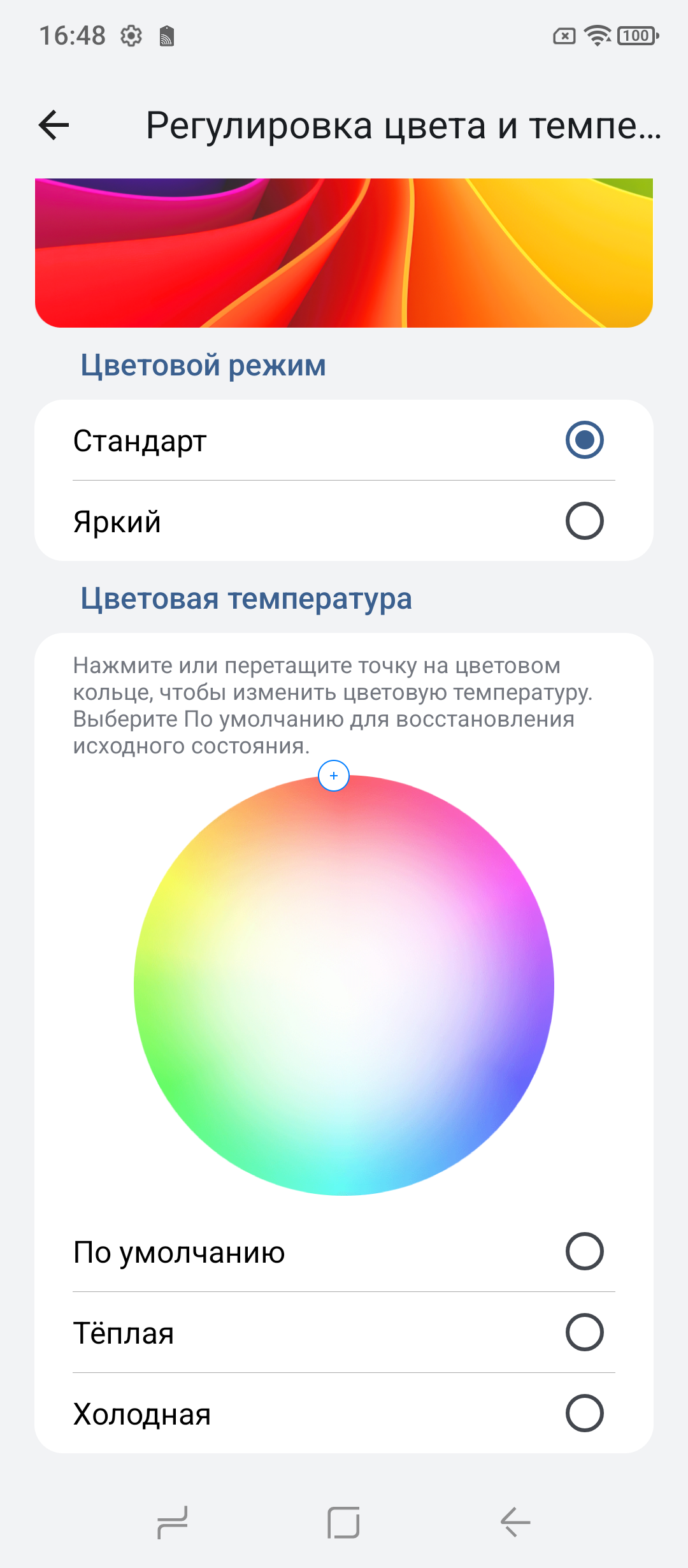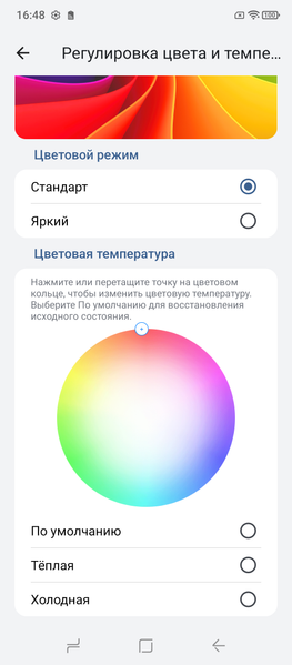 Также можно попытаться подстроить цветовой баланс выбором профиля цветовой температуры или двигая точку на круге.