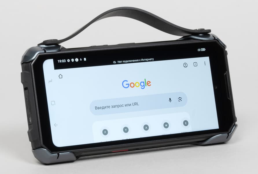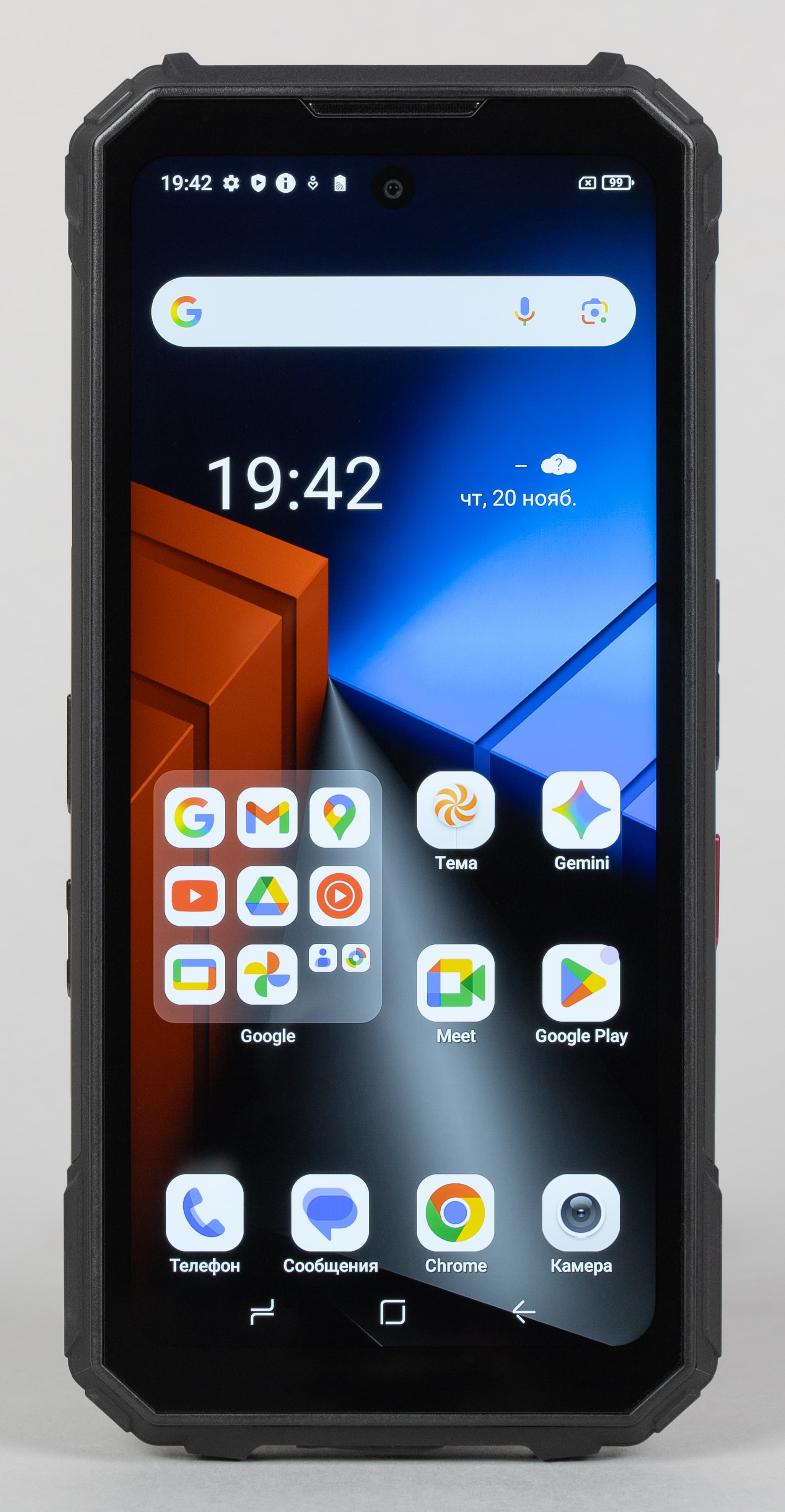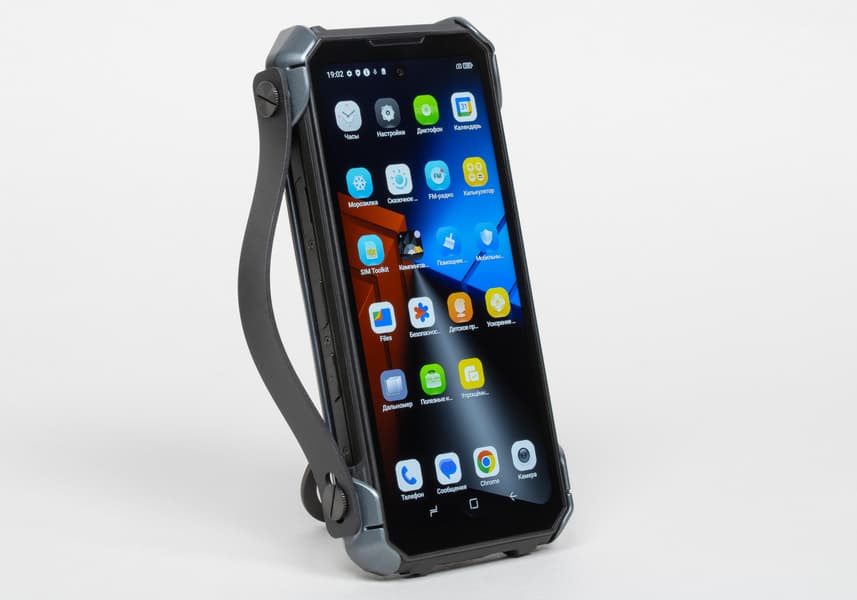 В целом, по дизайну — это типичный защищенный смартфон-внедорожник со всеми внешними атрибутами, такими как ребристые резиновые бока, металлические накладки, прикрученные винтами, резкие переходы и пестрое оформление.
