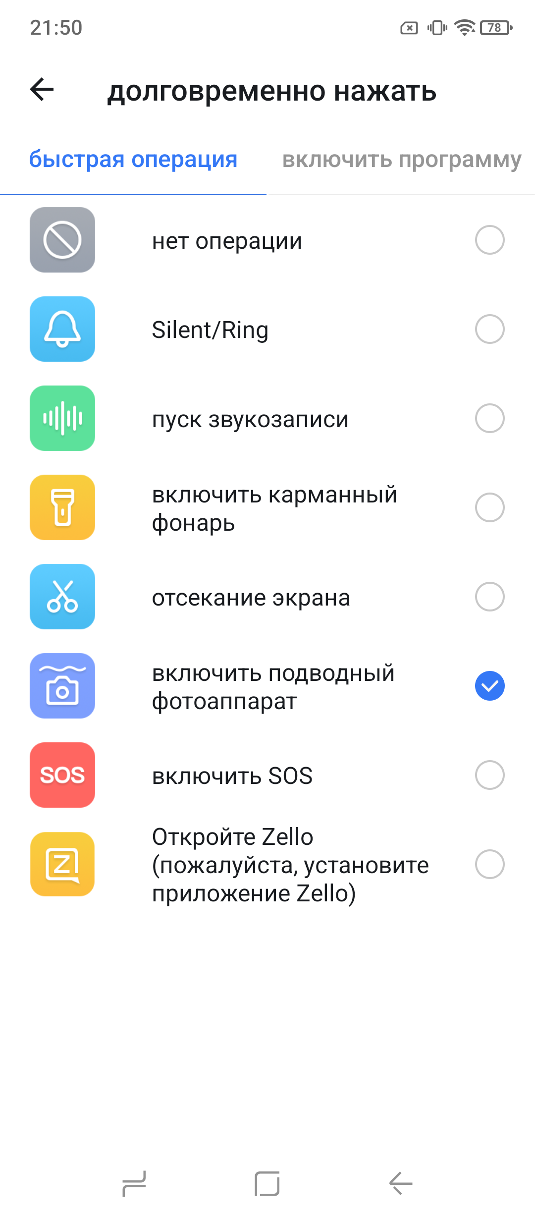 Упомянутая отдельная программируемая кнопка реализует через одиночное/двойное нажатие или долгое удержание различные заведенные на эти действия функции. Их можно выбрать самому в разделе настроек меню. Не всегда благозвучно, но хотя бы переведенного на русский язык, пусть и машинным переводом.