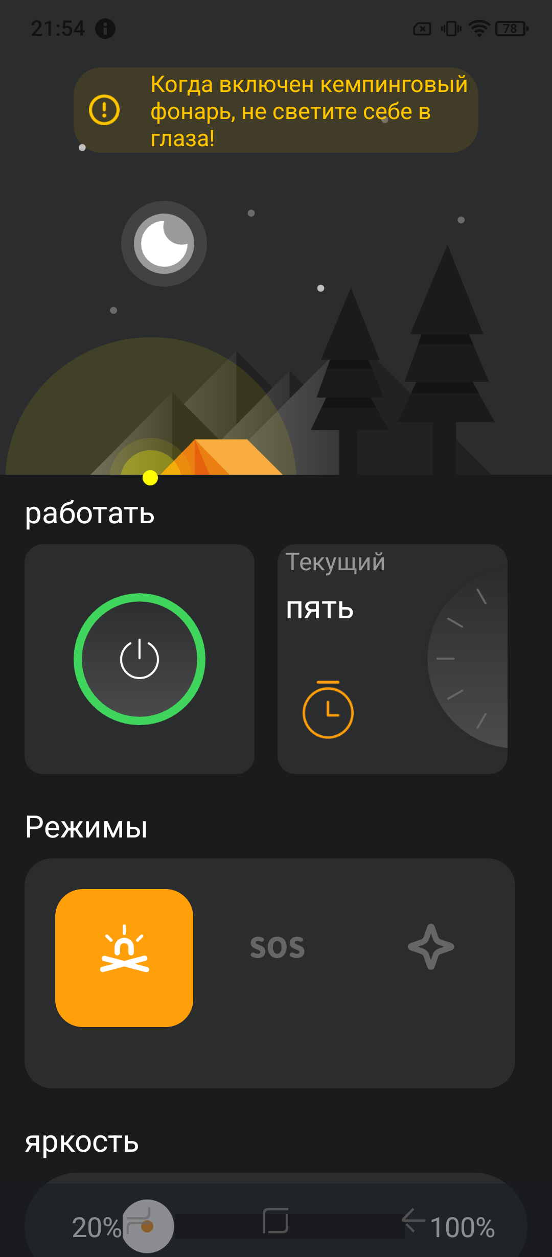 Кстати о фонаре. Помимо привычной светодиодной вспышки рядом с камерами, у данной модели имеется еще настоящий кемпинговый фонарь. Он выглядит как два желтых сегмента, сходящихся на конус на задней стенке. Если фонарь должным образом установить, он будет действительно освещать в ночи площадку перед палаткой для организационных нужд. Светит очень ярко (1200 люмен).