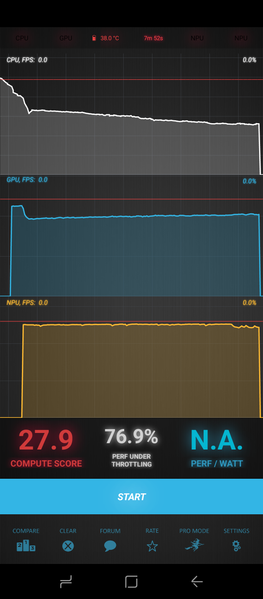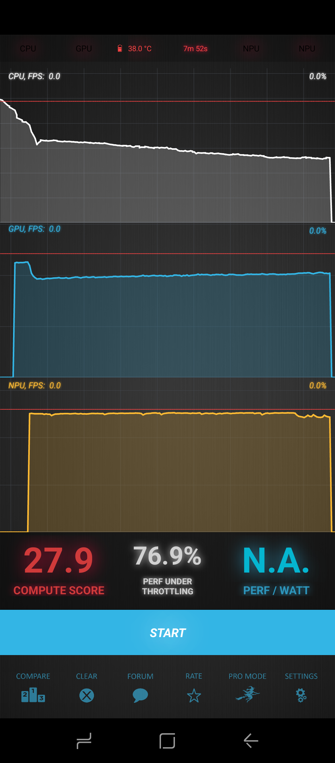 Тест на снижение производительности при нагреве мы проводим с помощью программы Burnout Benchmark, которая позволяет нагружать CPU, GPU и NPU. Уровень тротлинга при нагрузке на GPU (то бишь в играх) невысокий.