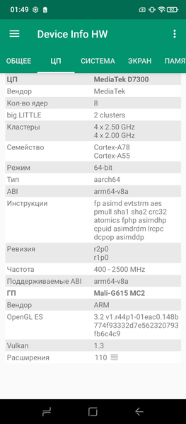 - SoC Mediatek Dimensity 7300, 8 процессорных ядер (4×Cortex-A78 @2,5 ГГц + 4×Cortex-A55 @2,0 ГГц)