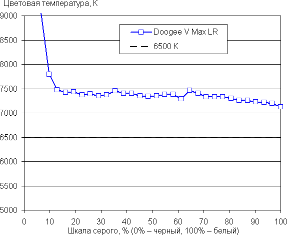 В этом устройстве есть возможность скорректировать цветовой баланс. Баланс оттенков на шкале серого без коррекции средний, так как цветовая температура существенно выше стандартных 6500 К. В случае максимальной коррекции оттенков в теплую сторону (точка на круге — как на снимке ниже) цветовой баланс удается улучшить — цветовая температура уже достаточно близка к стандартным 6500 К, и отклонение от спектра абсолютно черного тела (ΔE) ниже 10, что для потребительского устройства считается приемлемым показателем.