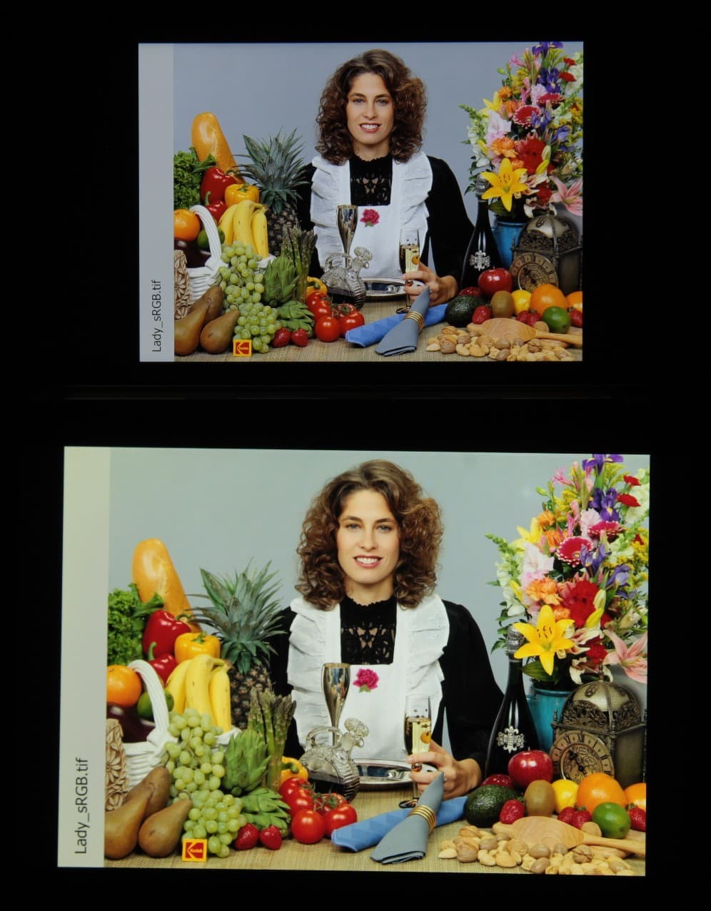 Цветопередача приемлемая — цвета в меру насыщенные, но слегка неправильные, цветовой баланс у экранов различается. Напомним, что фотография не может служить надежным источником сведений о качестве цветопередачи и приводится только для условной наглядной иллюстрации. Причина в том, что спектральная чувствительность матрицы фотоаппарата неточно совпадает с этой характеристикой человеческого зрения.