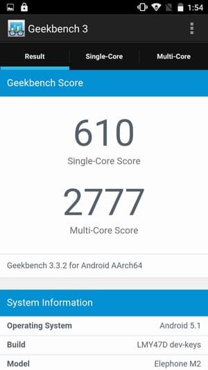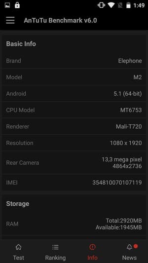 Аппаратная платформа Elephone M2 строится на базе восьмиядерной однокристальной системы (SoC) MediaTek MT6753. В конфигурацию данной SoC входит восемь процессорных ядер Cortex-A53, работающих на частоте до 1,3 ГГц. За обработку графики отвечает видеоускоритель Mali-T720 с тремя ядрами частотой до 450 МГц. Объем ОЗУ составляет 3 ГБ, а собственной памяти для нужд пользователя в устройстве доступно около 25 ГБ из общего объема 32 ГБ. Есть возможность установки карт microSD, но для этого необходимо изъять одну из SIM-карт, что не так удобно. Поддерживаются карточки объемом до 128 ГБ. На практике наша проверочная карта Transcend Premium microSDXC UHS-1 объемом 128 ГБ уверенно распозналась устройством. Смартфон не поддерживает подключение внешних устройств к порту USB в режиме OTG.