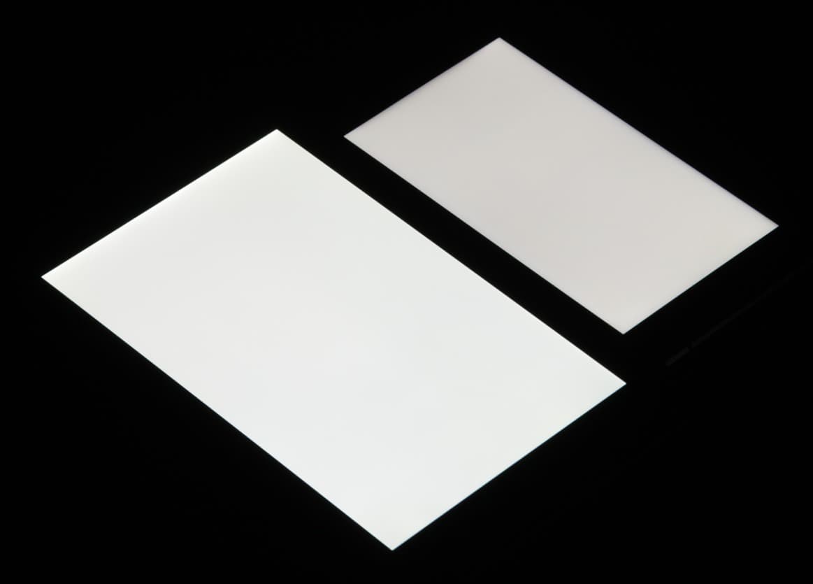 Лицевая поверхность экрана выполнена в виде стеклянной пластины с зеркально-гладкой поверхностью, устойчивой к появлению царапин. Судя по отражению объектов антибликовые свойства экрана не хуже, чем у экрана Google Nexus 7 (2013) (далее просто Nexus 7). Для наглядности приведем фотографию, на которой в выключенных экранах отражается белая поверхность (слева — Nexus 7, справа — Elephone M2, далее их можно различать по размеру):