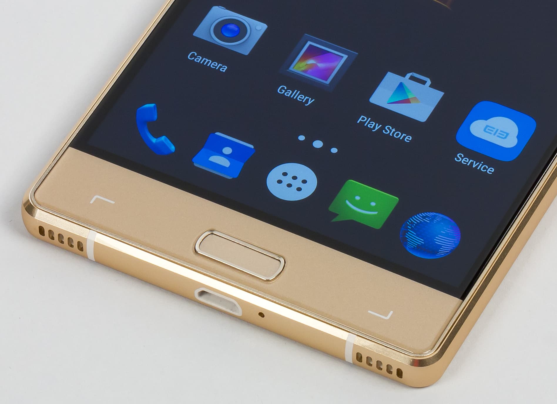 В нижней части под экраном расположены две сенсорные кнопки и одна механическая, вмещающая сканер отпечатков пальцев. Площадка сканера вмонтирована в продолговатую кнопку, напоминающую таковую в смартфонах Samsung. К работе сканера нет ни малейших претензий, срабатывает он очень быстро (распознавание происходит за 0,5 с), палец можно подносить под любым углом из возможных 360°, ошибочных срабатываний при тестовой эксплуатации выявлено не было.