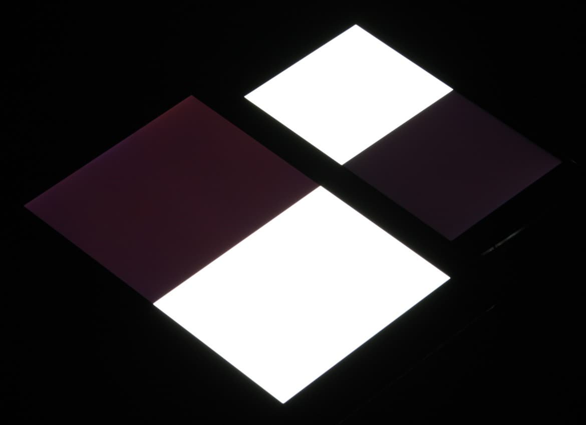 Яркость под углом у экранов уменьшилась (как минимум в 5 раз, исходя из разницы в выдержке), но у Elephone P8000 экран чуть-чуть темнее (средняя яркость по фотографиям 231 против 234 у Nexus 7). Черное поле при отклонении по диагонали высветляется слабо и приобретает красно-фиолетовый или зеленоватый оттенок. Фотографии ниже это демонстрируют (яркость белых участков в перпендикулярном плоскости экранов направлении одинаковая!):