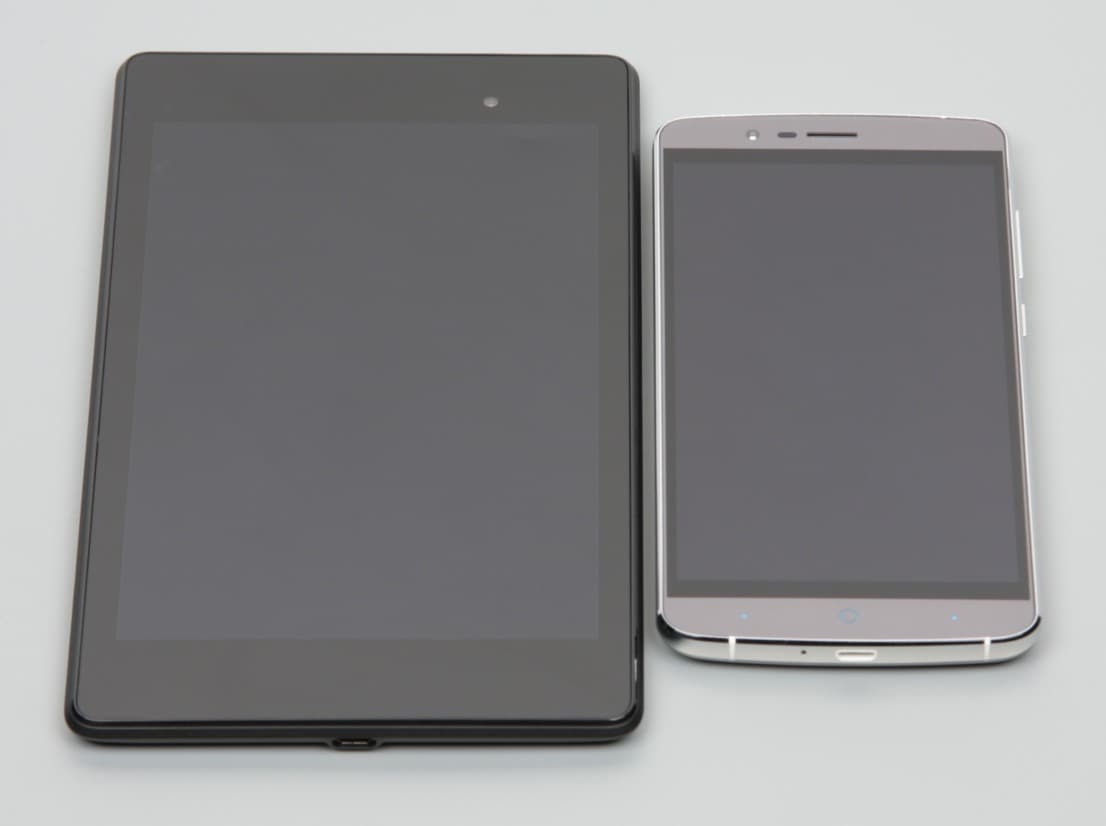 Лицевая поверхность экрана выполнена в виде стеклянной пластины с зеркально-гладкой поверхностью, устойчивой к появлению царапин. Судя по отражению объектов антибликовые свойства экрана не хуже, чем у экрана Google Nexus 7 (2013) (далее просто Nexus 7). Для наглядности приведем фотографию, на которой в выключенных экранах отражается белая поверхность (слева — Nexus 7, справа — Elephone P8000, далее их можно различать по размеру):