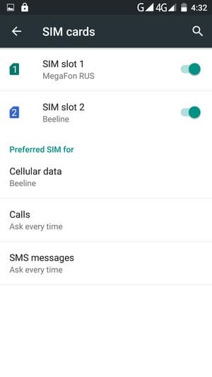 Смартфон поддерживает работу с двумя SIM-картами, и в целом работа с ними в меню организована по знакомому принципу: можно любую из SIM-карт назначить основной для организации голосовых звонков, передачи данных или отправки SMS-сообщений; при наборе номера также можно выбрать желаемую карту в контекстном подменю. С сетями 3G/4G может работать SIM-карта в любом слоте, однако одновременно в этом режиме может функционировать лишь одна из карт. Для смены назначений слотов карточки менять местами не требуется — это можно сделать прямо из меню телефона. Работа с двумя SIM-картами организована по привычному стандарту Dual SIM Dual Standby, когда обе карты могут находиться в активном режиме ожидания, но одновременно работать не могут — радиомодуль здесь только один.