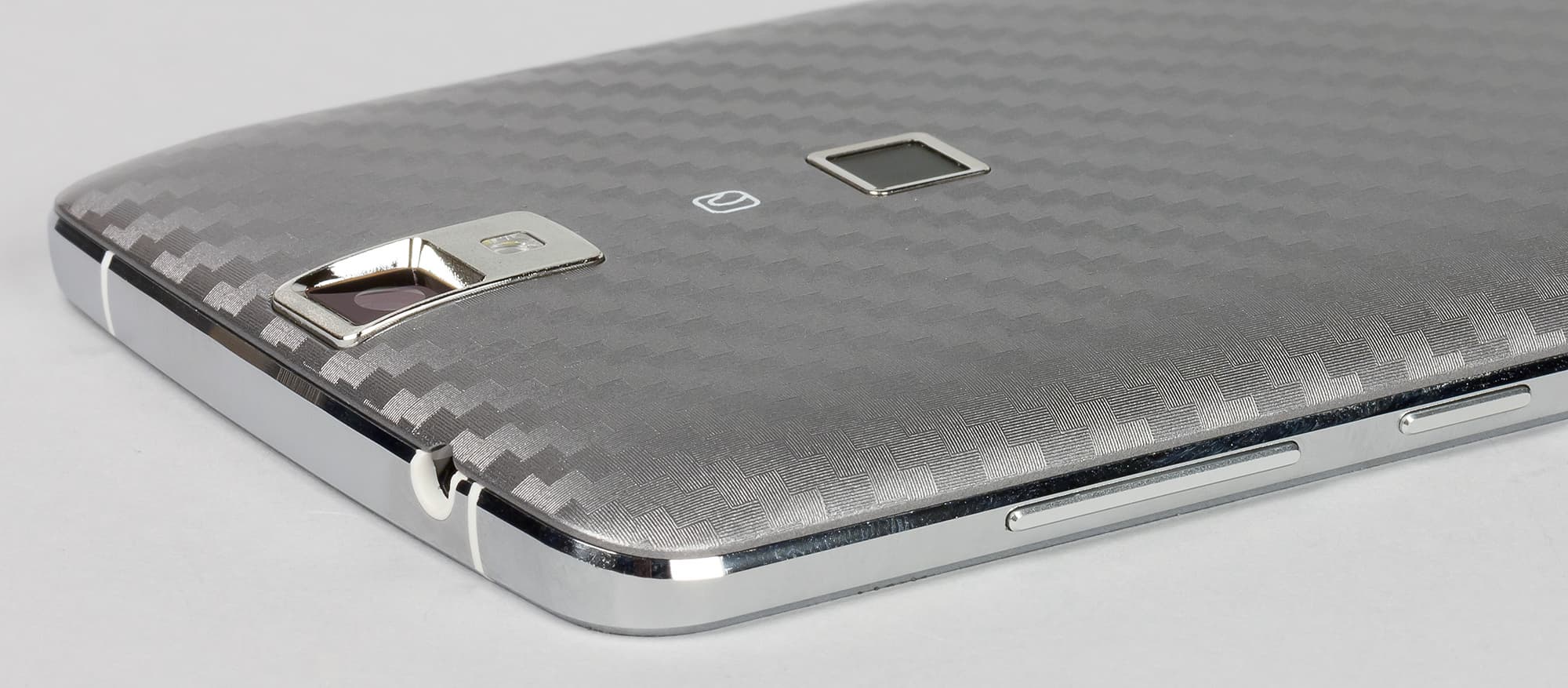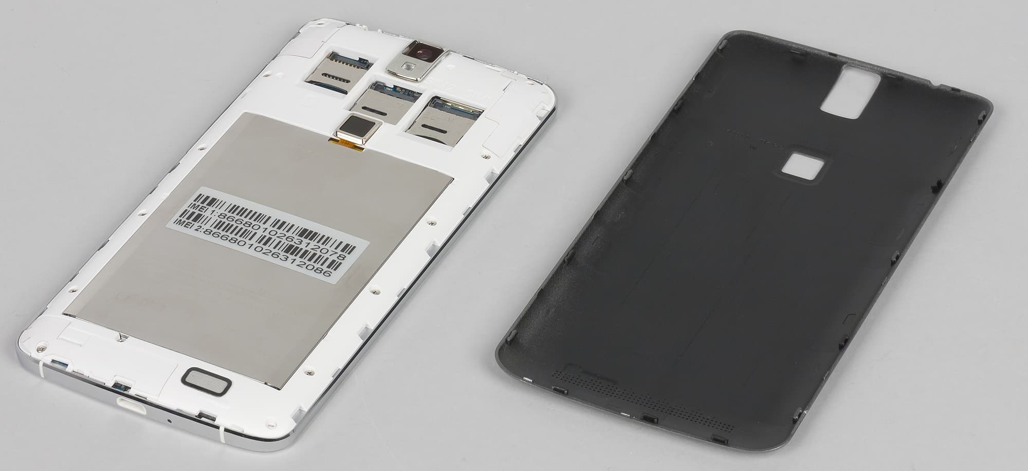 Задняя крышка при этом выполнена из обычной пластмассы, никакого углепластика тут на самом деле нет. Крышка жесткая и снимается чрезвычайно тяжело, поддеть ногтем и оторвать ее от корпуса оказывается проблематично и даже болезненно — скорее всего, придется прибегнуть к помощи какого-нибудь твердого и острого предмета. Под крышкой скрывается стандартный для китайских аппаратов набор из двух равнозначных разъемов для SIM-карт (под карточки формата Micro-SIM) и одного для карты памяти microSD. Карточки можно извлекать и вставлять без выключения аппарата, поскольку батарея здесь несъемная, однако горячая их замена все равно невозможна, в любом случае придется перезагружать устройство.