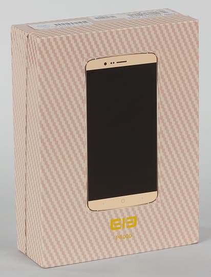 Elephone P8000 поставляется в продажу в объемной коробке, выполненной из твердого лакированного картона. Упаковка выполнена аккуратно, но оформлена скромно, неброско, имеет необычный косой срез на крышке.
