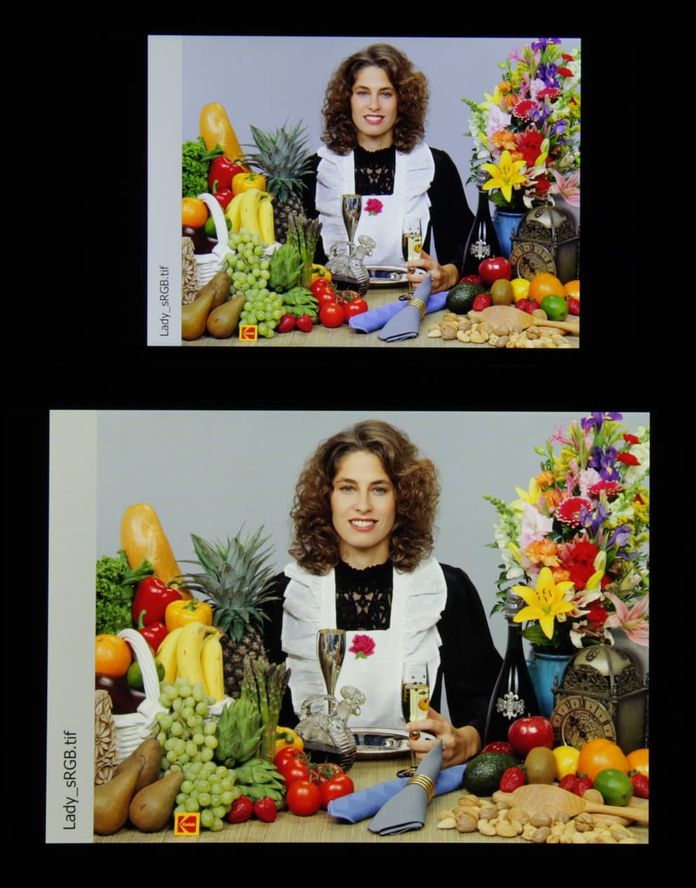 Однако отклонения координат первичных цветов от вершин треугольника sRGB небольшие, поэтому цвета имеют естественную насыщенность и оттенок. Баланс оттенков на шкале серого средний, так как цветовая температура выше стандартных 6500 К. Правда, отклонение от спектра абсолютно черного тела (ΔE) меньше 10, что для потребительского устройства считается приемлемым показателем. Однако при этом ΔE и цветовая температура существенно изменяются от оттенка к оттенку — это отрицательно сказывается на визуальной оценке цветового баланса. (Самые темные области шкалы серого можно не учитывать, так как там баланс цветов не имеет большого значения, да и погрешность измерений цветовых характеристик на низкой яркости большая.)