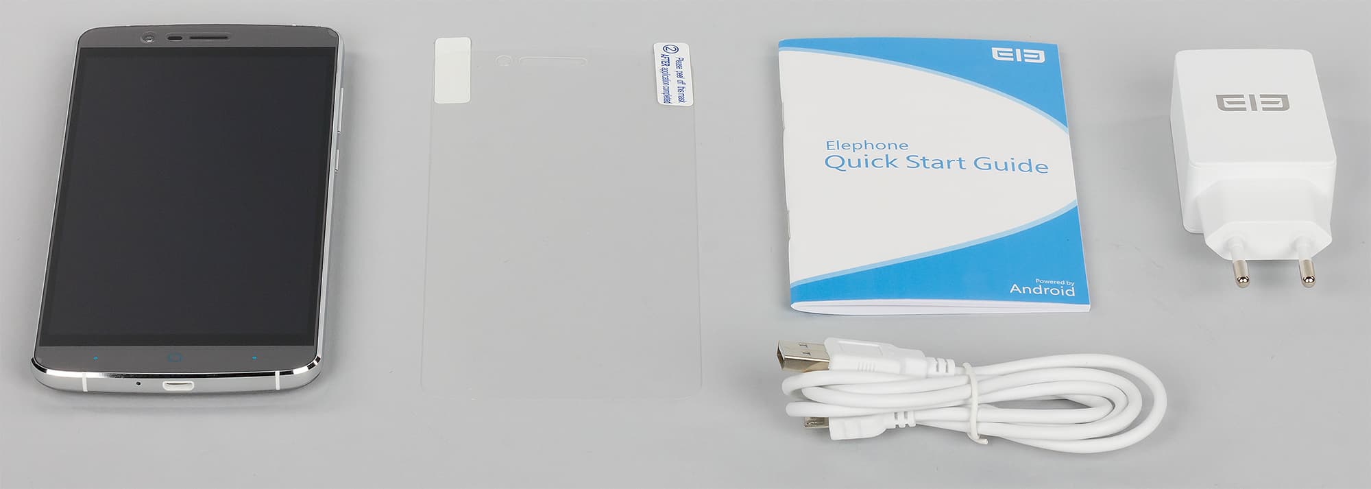 Комплект небогат, он состоит лишь из зарядного устройства и соединительного кабеля Micro-USB. Также в наборе оказалась защитная пленка на экран, но ее, скорее всего, вложил продавец, приславший нам аппарат на тесты.