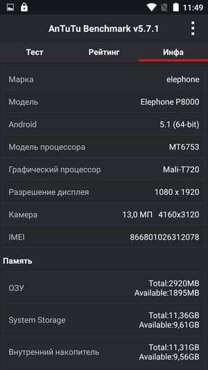 Аппаратная платформа Elephone P8000 строится на базе восьмиядерной однокристальной системы (SoC) MediaTek MT6753. В конфигурацию данной SoC входит восемь процессорных ядер Cortex-A53, работающих на частоте до 1,3 ГГц. За обработку графики здесь отвечает видеоускоритель Mali-T720. Объем ОЗУ составляет 3 ГБ, а собственной памяти для нужд пользователя в устройстве доступно около 11 ГБ из общего объема 16 ГБ. Есть возможность установки карт microSD, но не поддерживается подключение внешних устройств к порту USB в режиме OTG.