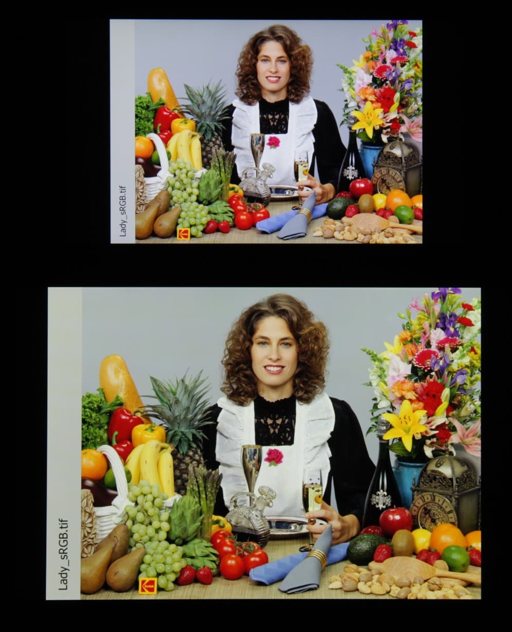 В итоге цвета имеют естественную насыщенность. Баланс оттенков на шкале серого компромиссный, так как цветовая температура сильно выше стандартных 6500 К, но отклонение от спектра абсолютно черного тела (ΔE) даже меньше 3, что для потребительского устройства считается очень хорошим показателем. При этом цветовая температура и ΔE мало изменяются от оттенка к оттенку — это положительно сказывается на визуальной оценке цветового баланса. (Самые темные области шкалы серого можно не учитывать, так как там баланс цветов не имеет большого значения, да и погрешность измерений цветовых характеристик на низкой яркости большая.)