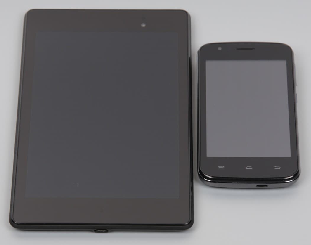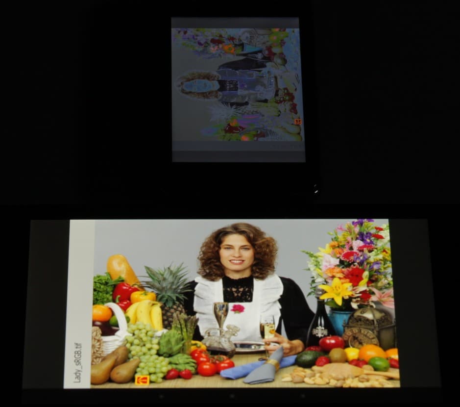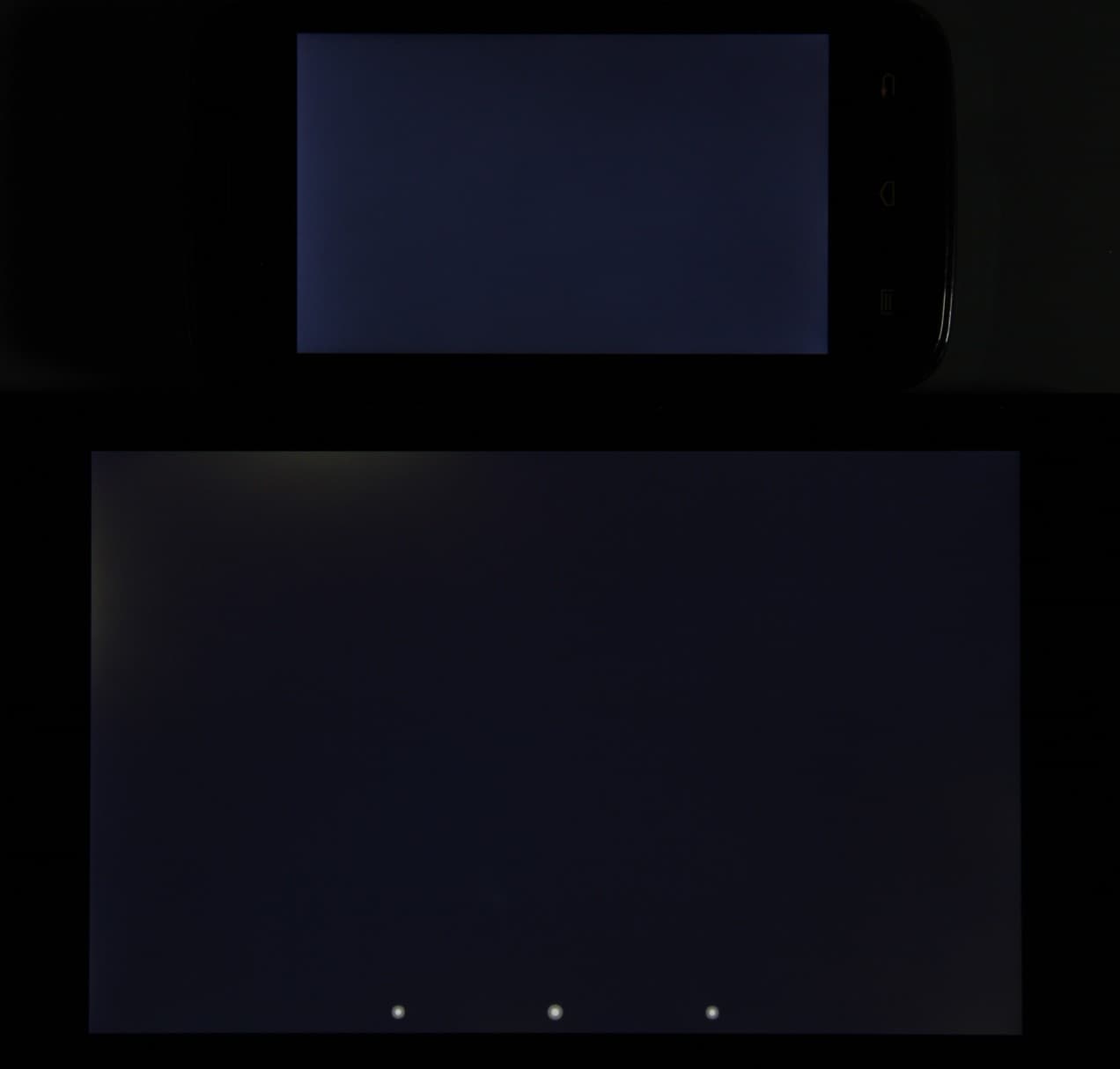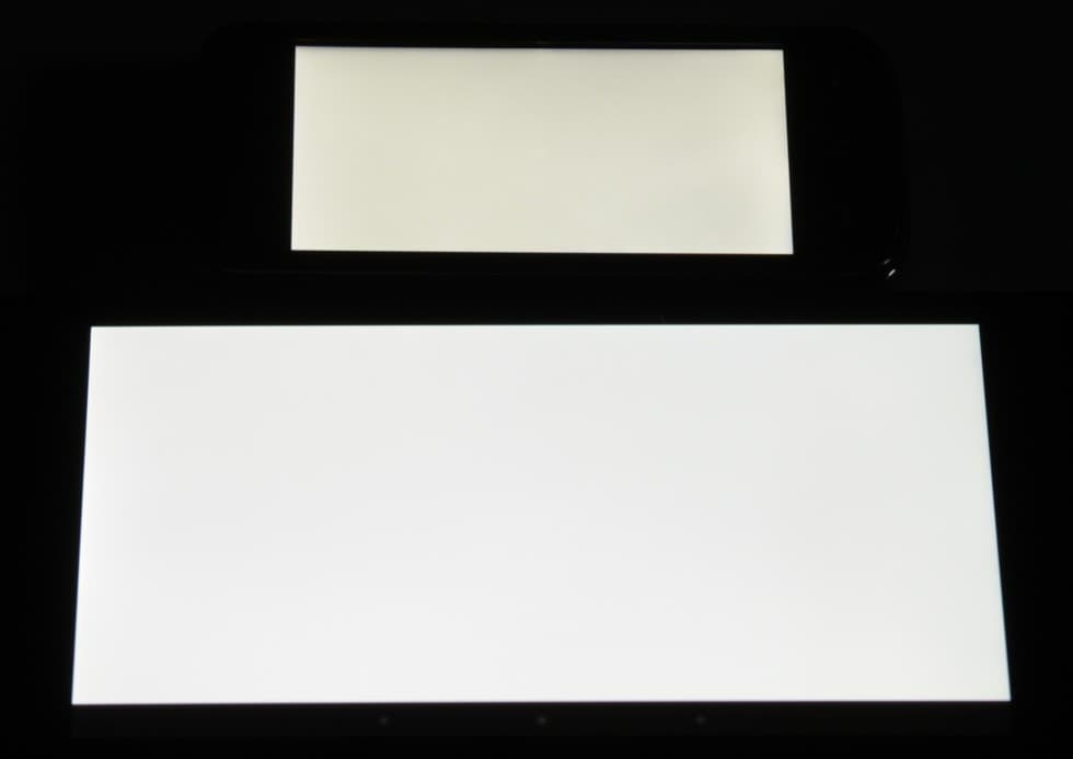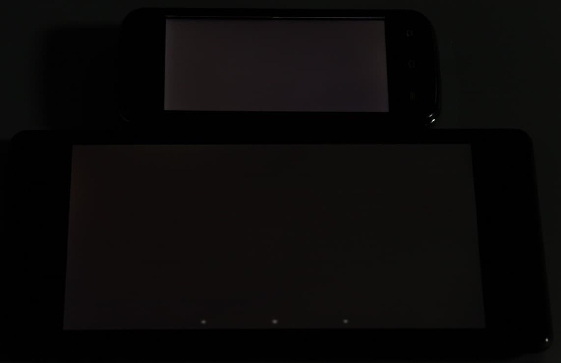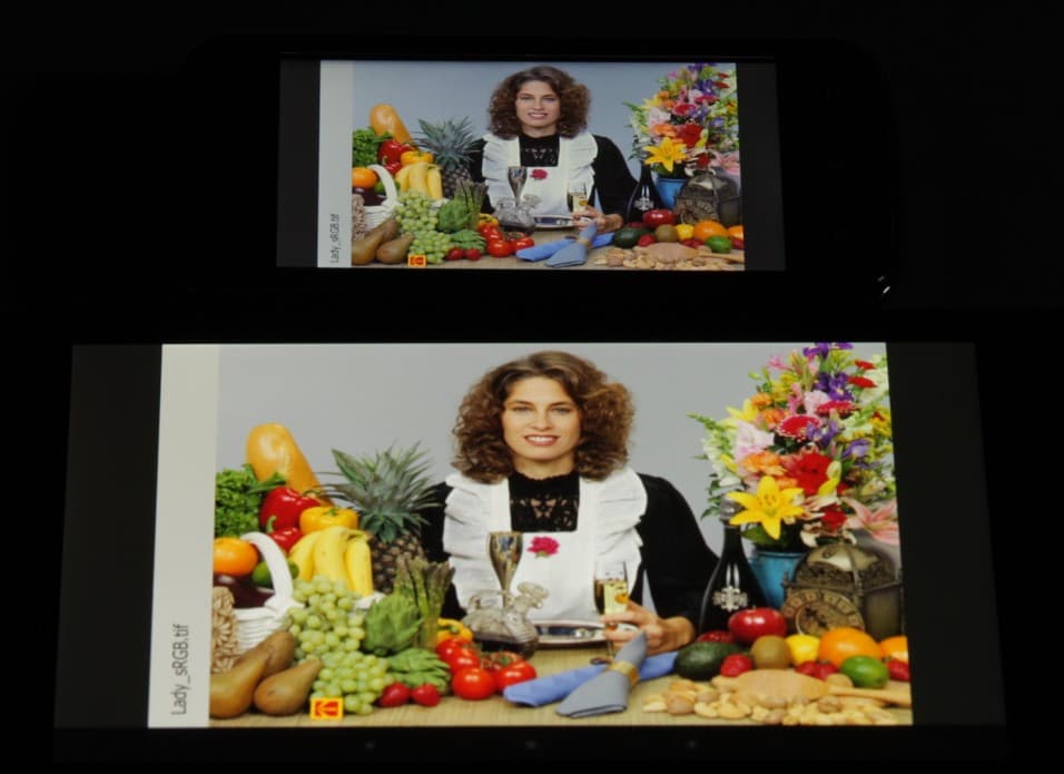 Экран имеет хорошие углы обзора в горизонтальном направлении, но при малейшем отклонении вверх инвертируются темные оттенки, при отклонении вниз — светлые. Для сравнения приведем фотографии, на которых на экраны Nexus 7 и тестируемого устройства выведены одинаковые изображения, при этом яркость обоих экранов установлена примерно на 200 кд/м². Перпендикулярно к экранам тестовая картинка: