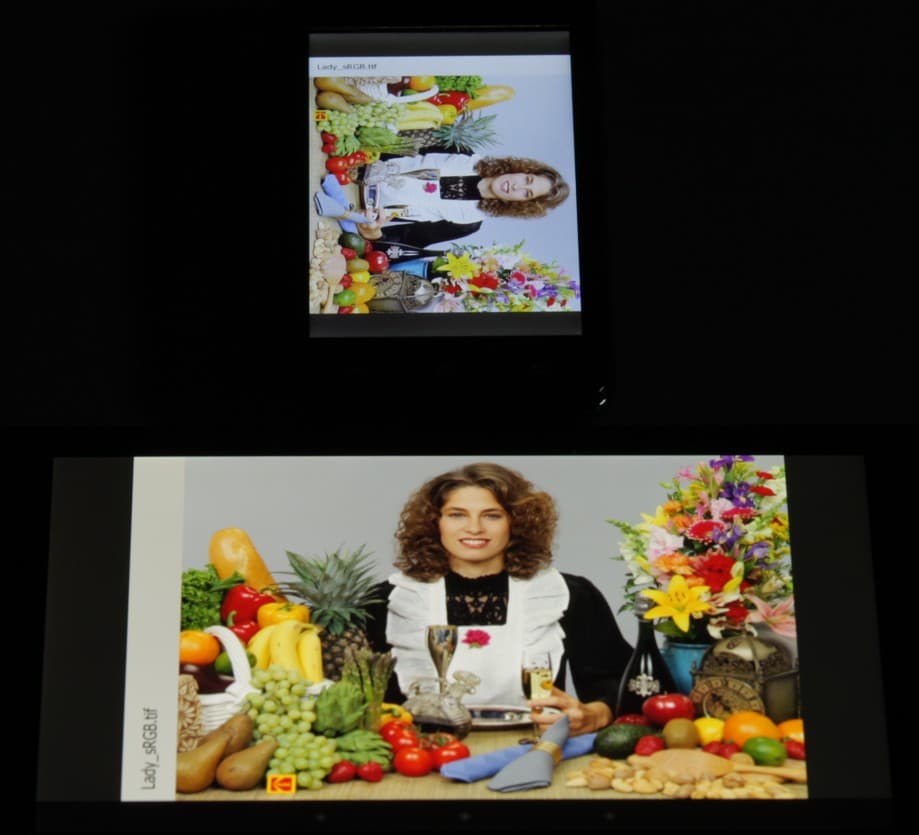 Интервалы между кадрами (или группами кадров) чередуются немного неравномерно и в случае файлов с 50 и 60 кадр/с некоторая часть кадров всегда пропускается. При воспроизведении видеофайлов 720p и 1080p изображение собственно видеофайла выводится точно по широкой границе экрана. Отображаемый на экране диапазон яркости чуть-чуть не соответствует стандартному диапазону (то есть диапазону 16—235) — в светах пара оттенков неотличима по яркости от белого цвета, но в тенях различаются все градации оттенков. Отметим, что картинка наших тестовых файлов в динамике постоянно распадалась на большие квадратики, и иногда масштаб этого имел катастрофические для качества изображения последствия.