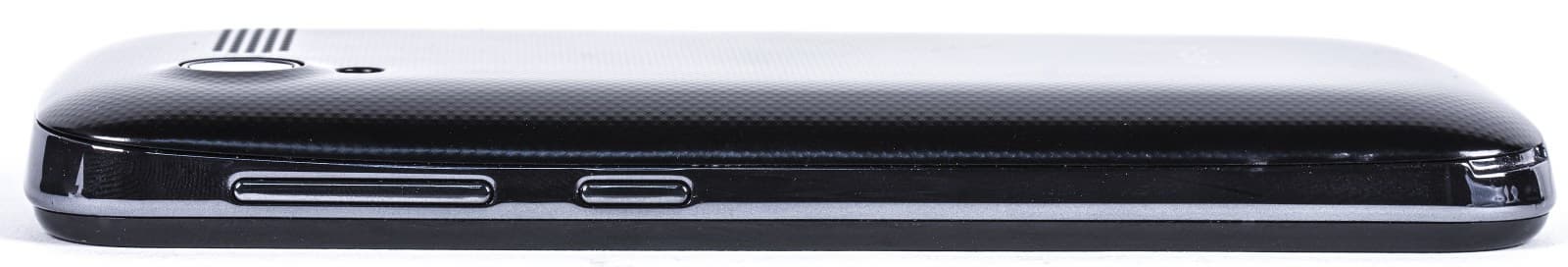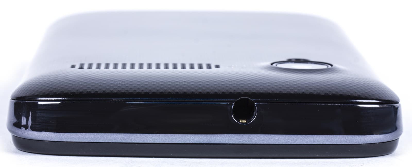 Толстое зеркально-глянцевое ребро смартфона изготовлено из пластика, как и, собственно, весь корпус. Сверху в нем вырезан разъем для наушников. В приведенном сверху ракурсе может показаться, что верхняя часть смартфона толще нижней — на самом деле, это обман зрения.