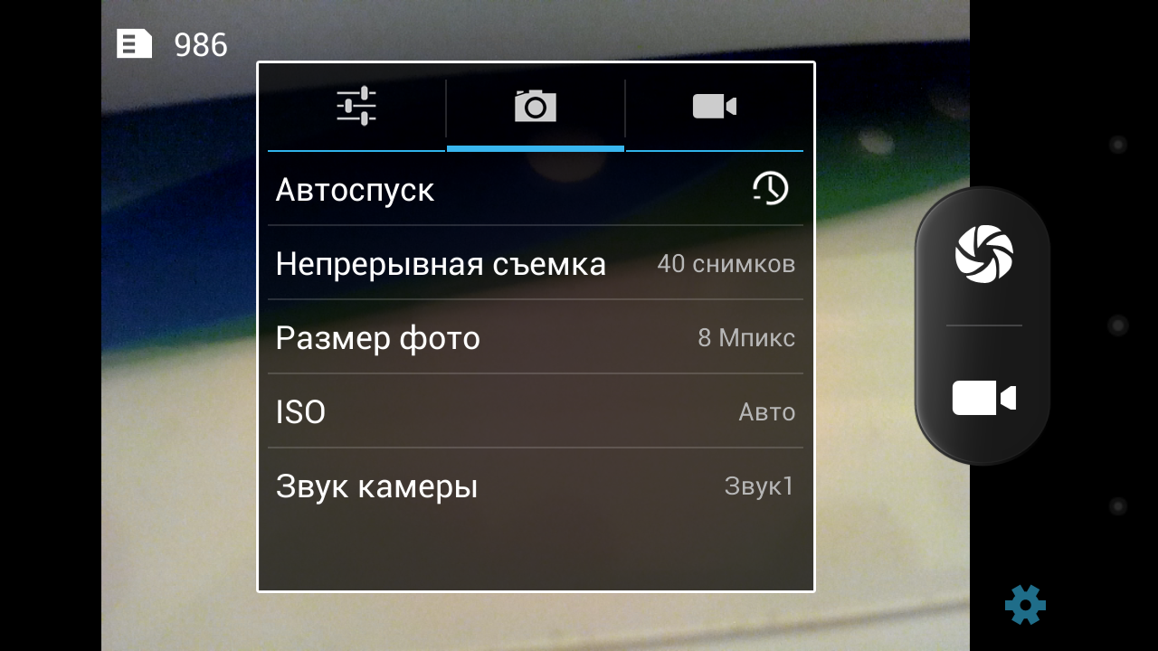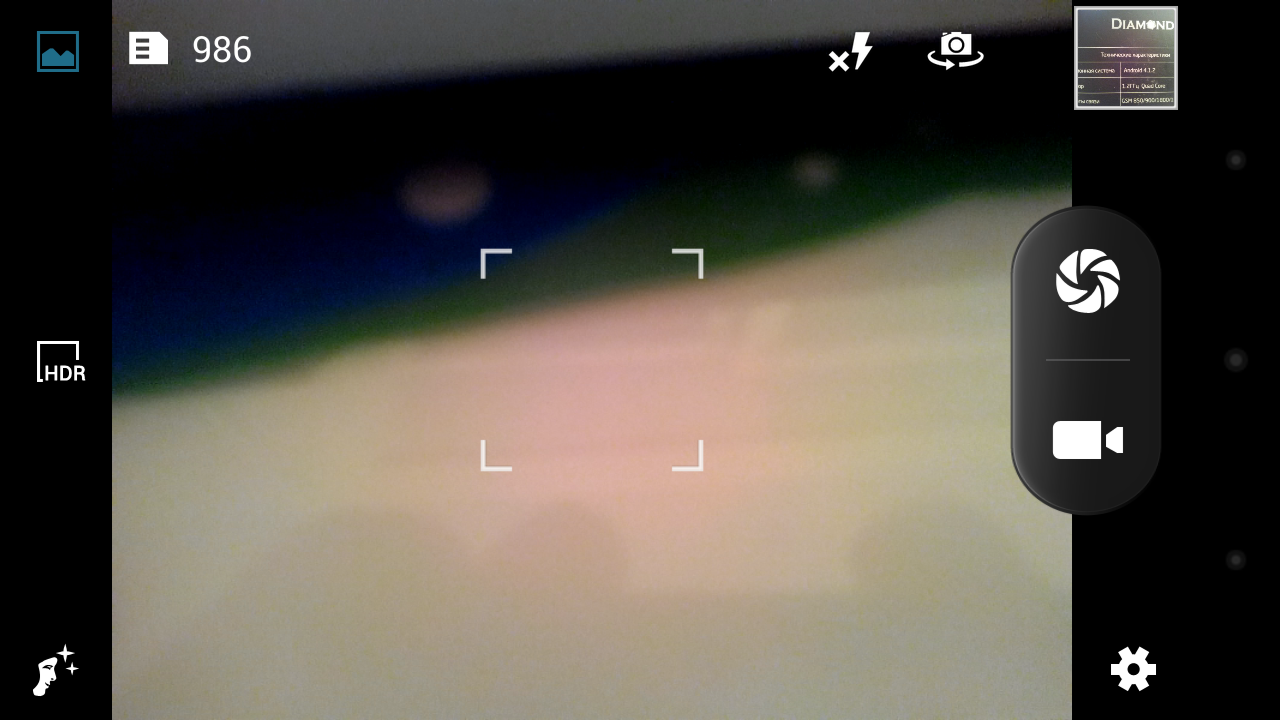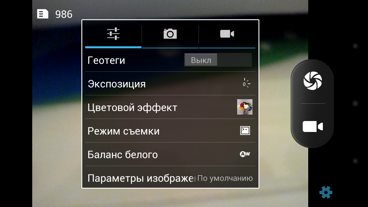 Внешний вид программы управления камерой незамысловат. Слева представлены переключатели обычной съемки, HDR и «красивое лицо». Что значит последний режим можно только догадываться, вероятно камера реагирует на улыбку при съемке портрета. Рядом с ними находится счетчик оставшихся при нынешнем доступном объеме памяти снимков, смартфон может использовать внутреннюю память или внешнюю карту памяти для их хранения. По другую сторону экрана находятся значки фото- и видеосъемки, переключения между основной и дополнительной камерами, управления встроенной светодиодной вспышкой, перехода в альбом с результатами съемки и вызова меню с прочими настройками камеры. Перечислять их все не имеет особого смысла, все настройки разбиты на три категории и три закладки: общие, фото и видео. На следующих снимках экрана видно большинство из них.