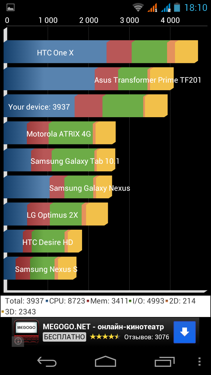 Тест Softweg Banchmark достаточно старый и измеряет производительность лишь одного ядра процессора, памяти, файловой системы и двумерной графики. Приятный сюрприз преподнесла как раз оперативная память, судя по оценке герой обзора укомплектован очень быстрой ОЗУ. В остальном, Fly IQ444 Diamond 2 никак не выделяется и не уступает своим собратьям — смартфонам с MTK6589.