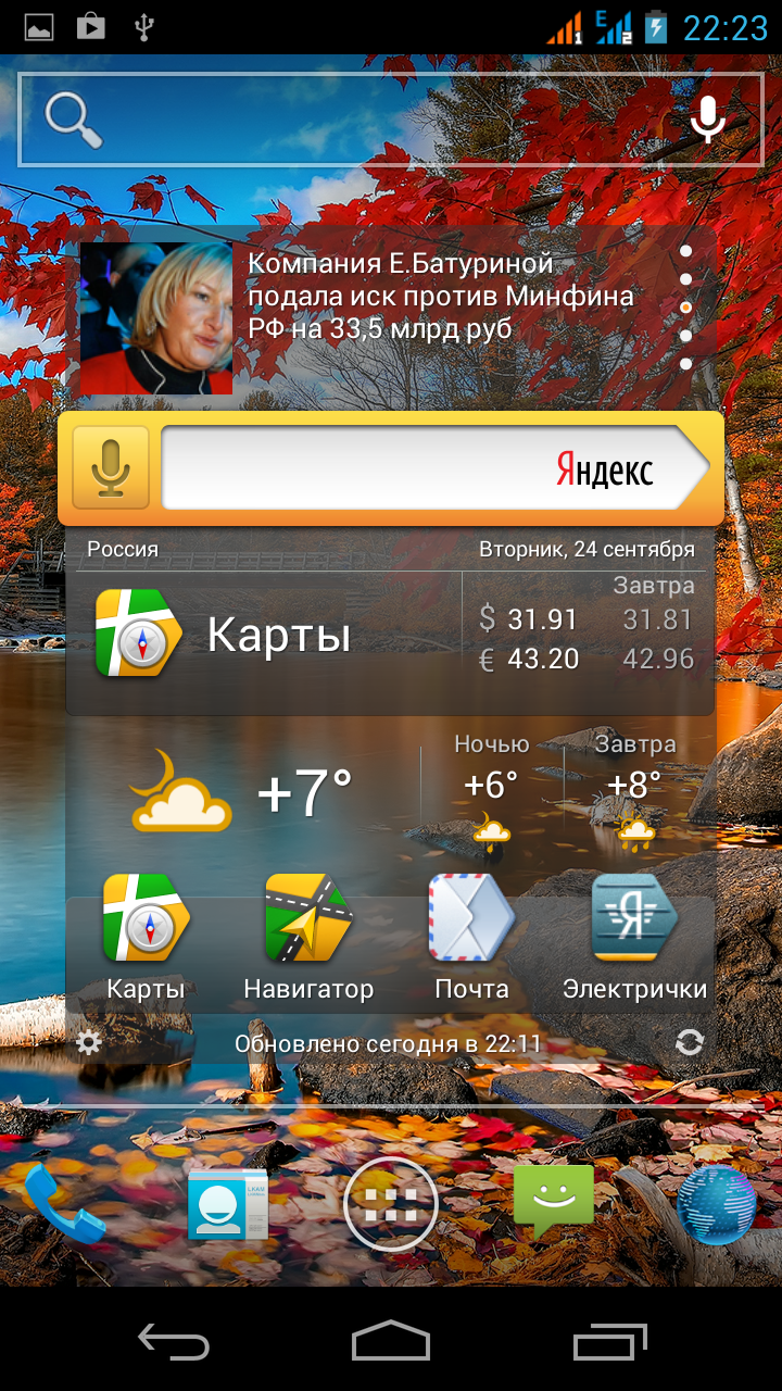 Забавно, но одних только клиентов социальных сетей в Fly IQ444 Diamond 2 четыре: Facebook, Twitter, Вконтакте и Одноклассники. К ним можно прибавить добровольно-принудительный Google+. Сервисы ivi.ru и SPB TV отвечают за потоковые трансляции фильмов и телепередач по сети. Одну из вкладок основного экрана занимает огромный виджет Яндекса с помощью которого можно не только ознакомиться с различной информацией, но и загрузить приложения одноименной компании.