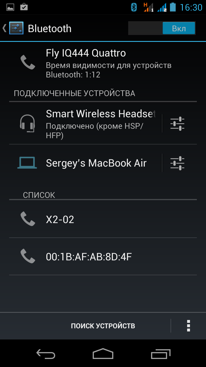 Скорость обмена данными по протоколу Bluetooth между Fly IQ444 Diamond 2 и MacBook Air составила 1,5 Мбит/с. В список профилей работы Bluetooth входят: приватная сеть, модем, передача файлов, доступ к адресной книге, подключение к гарнитуре, подключение к стереогарнитуре. Никаких особых нареканий в ходе проверки их работоспособности не возникло. В паре Fly IQ444 Diamond 2 и беспроводной гарнитуры Sony MW1 возможности остались на базовом для обоих устройств уровне: прослушивание музыки (без названия треков), прием телефонных вызовов (без демонстрации имени абонента).