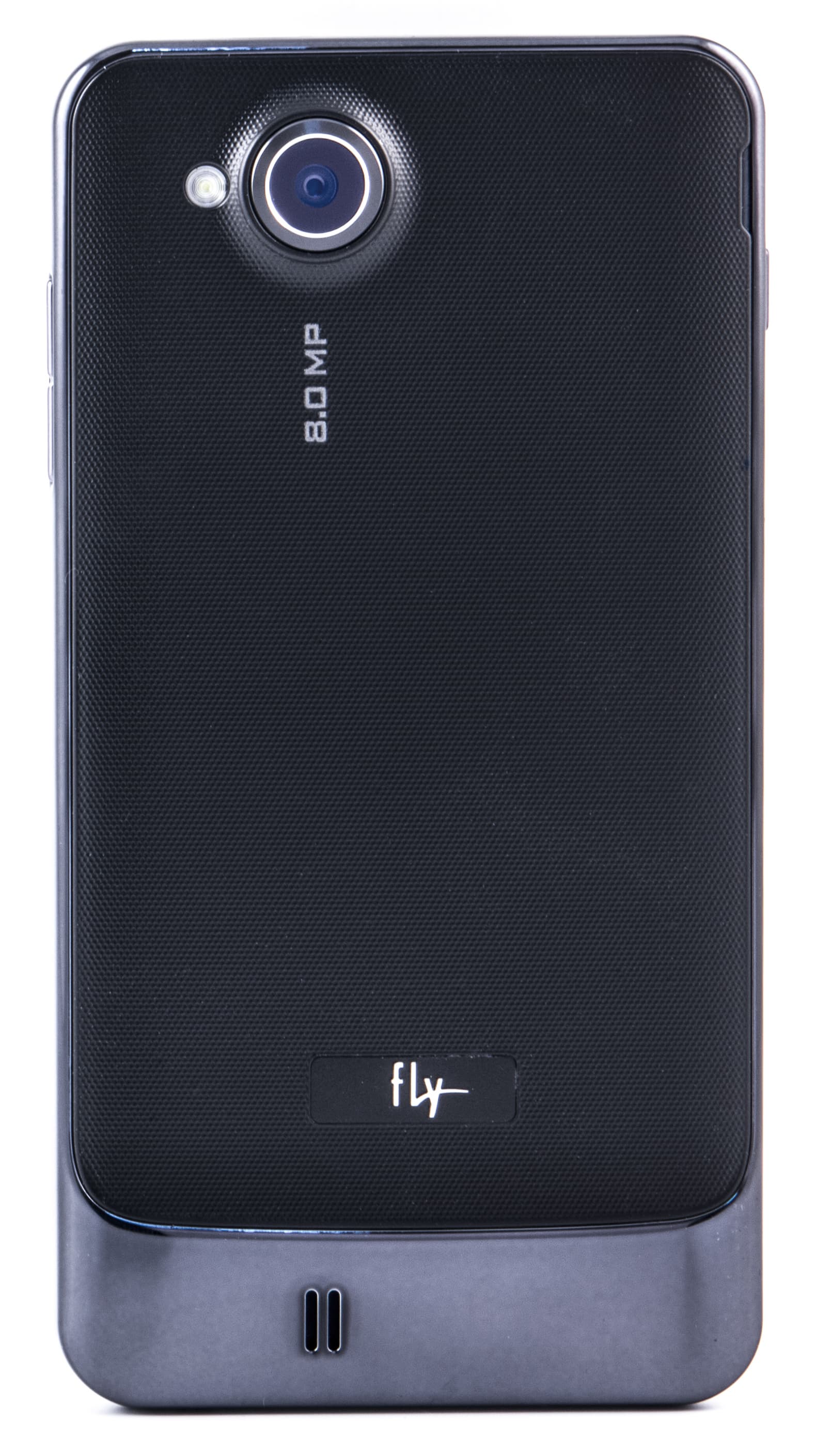 Задняя часть Fly IQ444 Diamond 2 визуально и фактически состоит из двух деталей: крышки аккумуляторного отсека и выступа корпуса с отверстием для динамика. На крышке нанесены две небольшие надписи, одна — название компании-изготовителя смартфона, вторая — разрешение камеры. Отсоединяется крышка от корпуса без особых проблем, держится она на множестве небольших защелок. Обратная установка также не вызывает затруднений. Для того, чтобы крышку было удобнее подцепить ногтем, разработчики предусмотрели выемку в ее правом верхнем углу.