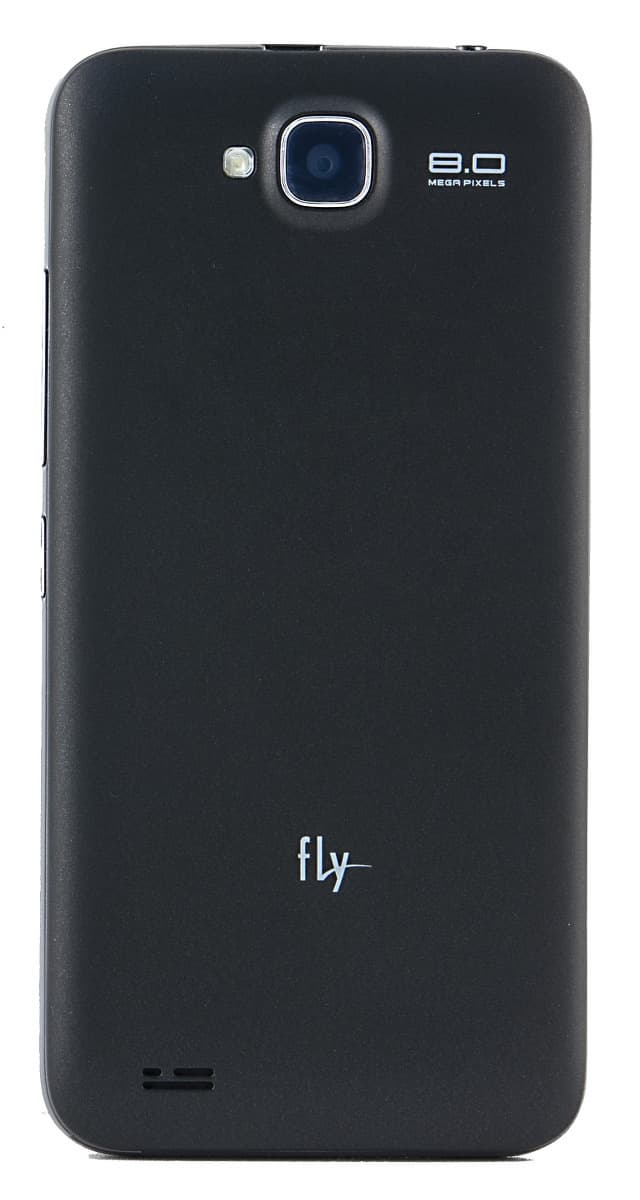 Подобный дизайн корпуса аппарата принято считать стандартным для массовых моделей. Однако если проследить прошлые модели Fly, то можно заметить некоторую преемственность. Габаритные размеры и вес удачно согласованы, устройство хорошо лежит в руке, если она у вас больше среднего размера. Конечно, управляться с экраном диагонали 4,5″ нужно двумя руками. Очень порадовала толщина — когда некоторые пытаются ставить рекорды, другие компании просто используют удобные решения. Размеры устройства составляют 135×66 мм. Окошко камеры немного выступает и формально толщину надо оценивать как 11 мм, но основной корпус все-таки тоньше — примерно 9 мм. Форма смартфона не отличается оригинальностью но все-таки выглядит строго и универсально, без намека на «глянцевую пластмассовую мыльницу».