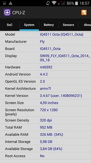 Аппаратная платформа Fly Tornado One строится на базе восьмиядерной однокристальной системы (SoC) MediaTek MT6592, только в данном случае используется урезанная версия MT6592m с более низкой частотой процессорных ядер ARM Cortex-A7 (в данном случае — 1,4 ГГц). За обработку графики здесь отвечает видеоускоритель Mali-450MP. Собственной памяти для нужд пользователя в устройстве предусмотрено около 5,5 ГБ, ее можно увеличить с помощью карты памяти microSD объемом до 32 ГБ (некоторые карточки на 64 ГБ тоже могут поддерживаться вопреки ограничениям официальных спецификаций). Объем оперативной памяти составляет 1 ГБ, что для современных реалий может оказаться маловато. Режим подключения внешних устройств к порту Micro-USB (OTG) в аппарате не поддерживается.