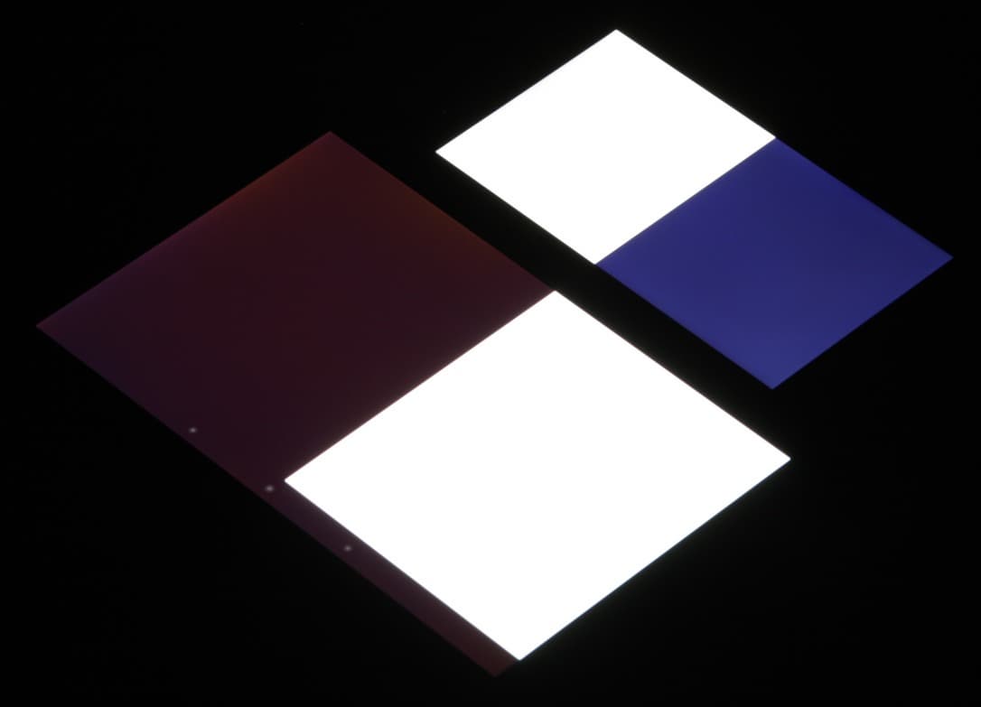 Яркость под углом у экранов уменьшилась (как минимум в 5 раз, исходя из разницы в выдержке), но в случае Fly Tornado One падение яркости больше. Черное поле при отклонении по диагонали высветляется сильно и приобретает фиолетовый или красно-фиолетовый оттенок. Фотографии ниже это демонстрируют (яркость белых участков в перпендикулярном плоскости экранов направлении примерно одинаковая!):