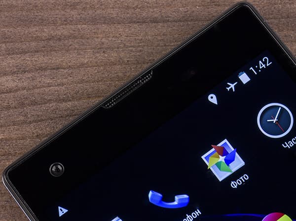 Выход звука из основного динамика здесь организован не на тыльную сторону, а в нижний торец — в нем по бокам обустроены две симметричных решетки, образованных массивами мелких отверстий в корпусе. Однако стереодинамиков здесь нет, это всего лишь имитация, и на самом деле только за одной из решеток спрятан динамик. Даже разговорный микрофон спрятан не за второй решеткой, а в маленькой щели между передним стеклом и пластиком.