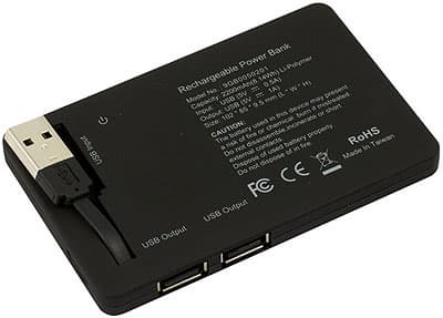 Параллелепипед из приятной на ощупь пластмассы имеет размеры 102 х 65 х 9,5 мм. На лицевой поверхности можно обнаружить шесть светодиодов, на одном из длинных торцов — два USB-порта, на коротком — кнопку, включающую подачу питания на них (судя по всему такой механизм применен потому, что USB-розетки А-типа имеют достаточно большие размеры, что может привести к попаданию туда мусора, короткому замыканию и быстрому разряду встроенного аккумулятора вследствие этого), а снизу можно найти короткий USB-кабель, служащий для подключения устройства к компьютеру, либо другому источнику тока с соответствующей розеткой. Все, что требуется от последнего — обеспечивать подачу тока, напряжением 5 В и силой 0,5 А, т.е. в точности по спецификациям USB. Соответственно, подключаем к источнику тока — заряжаем встроенный Li-Pol аккумулятор емкостью 2200 мАч и напряжением 3,7 В судя по всему (на корпусе указана и емкость в Втч — 8,14), контролируя процесс зарядки по пяти красным светодиодам на лицевой поверхности. Зарядили — кладем в карман/сумку или еще куда-нибудь и отправляемся в места нецивилизованные безрозеточные. Понадобилось нам в них зарядить какое-нибудь устройство — подключаем его кабель к одному из выходных портов, нажимаем кнопку (после чего загорается зеленый светодиод, символизируя подачу напряжения) и процесс идет. Одной «порции» заряда достаточно, например, чтобы полностью зарядить аккумулятор коммуникатора HTC Max 4G или ему подобного устройства, имеющий емкость 1,5 Ач, а для какого-нибудь мобильного телефона этого количества энергии достаточно и на две полных зарядки.