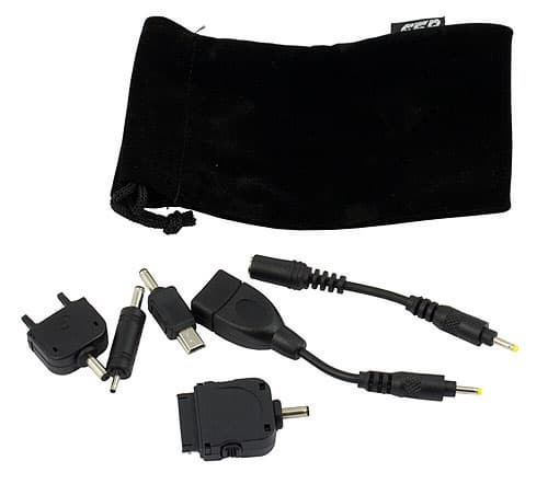 Во-вторых, сам выход «абстрактно-круглый», а для подключения устройств следует использовать кабель-переходник, коих в комплекте два. Первый снабжен USB-розеткой и позволяет (как и в предыдущем случае) заряжать любое устройство с использованием его «родного» USB-кабеля, второй же служит основой для одной из четырех сменных насадок: USB mini-B, «тонкая» Nokia, SonyEricsson и Apple. Таким образом, если вам нужно зарядить устройство с одним из последних четырех типов разъема, не придется использовать для этого длинный кабель — достаточно короткого штатного. Это плюс. Ну а минусов два: во-первых, насадка может и потеряться, благо маленькая, во-вторых, если нужно заряжать что-то не попадающее в данный список (например, телефон или плеер от Samsung), придется использовать аж два кабеля. Именно поэтому подход в старшей (с точки зрения емкости) модели нам понравился больше.