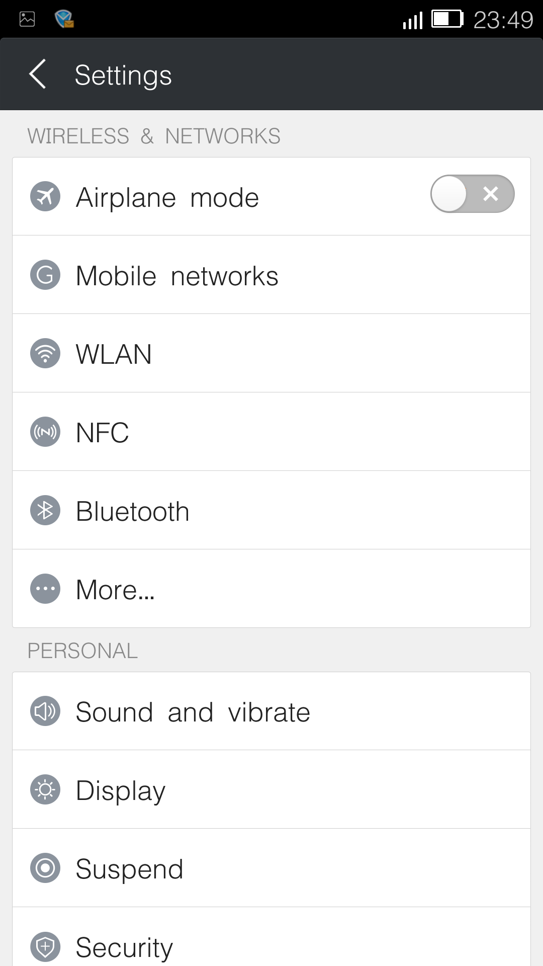 Внешний вид ОС Android в Gionee Elife E7 сильно изменен: заменены экран блокировки и оболочка, перетасованы пункты меню настроек, черный стиль оформления заменен на белый. В качестве языка интерфейса доступны только китайский и английский. При активации последнего большинство пунктов меню настроек становятся английскими, их перевод достаточно качественный и понятный. Перевод оболочки (Navi Launcher), наоборот, имеет кучу ошибок, а местами нет-нет да и встречаются китайские иероглифы. Множество китайских приложений в памяти Gionee Elife E7 вовсе демонстрируют только китайский текст.